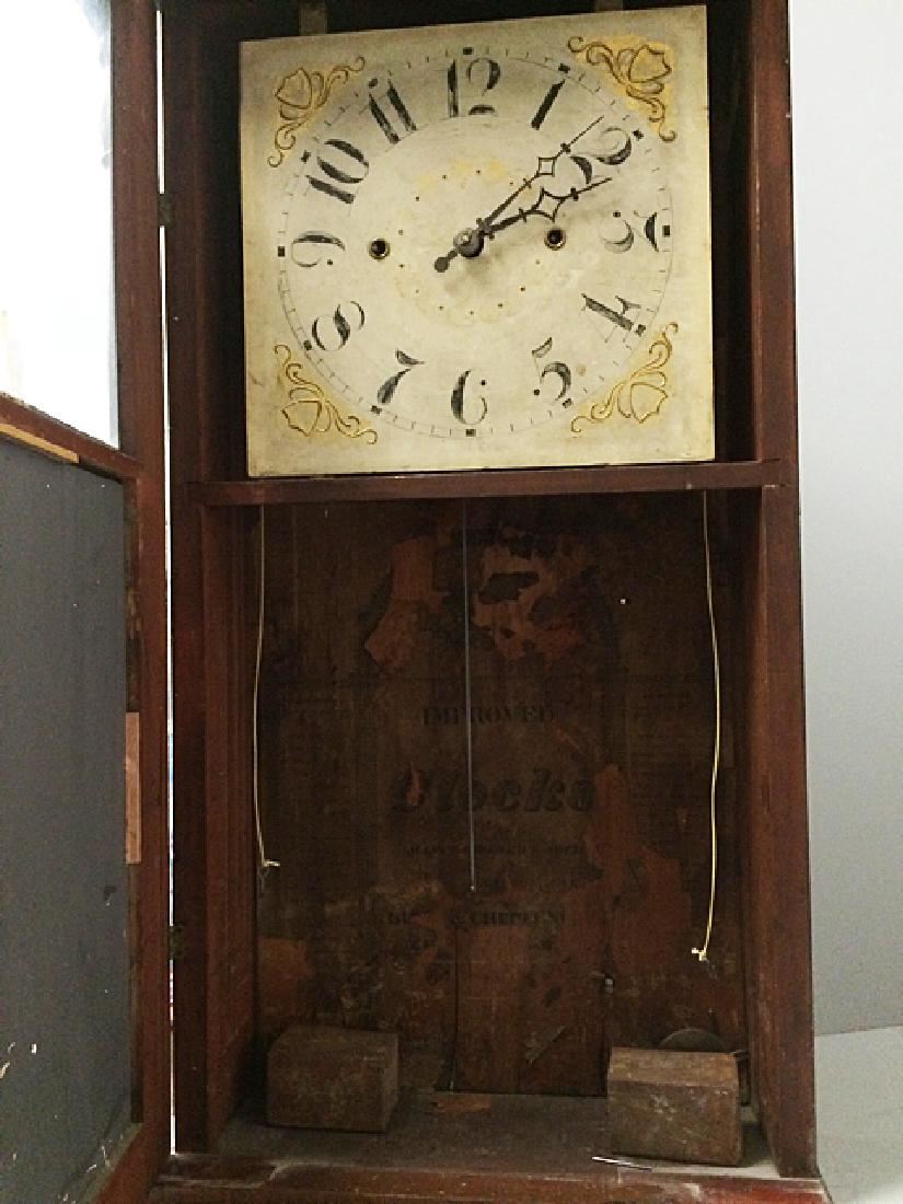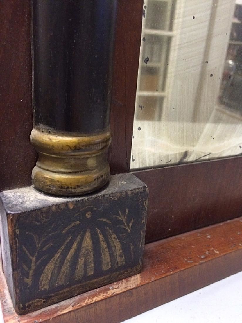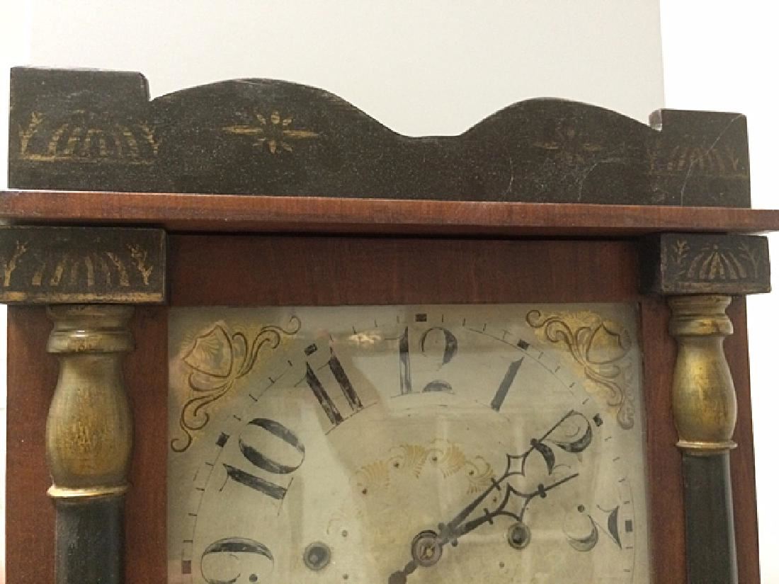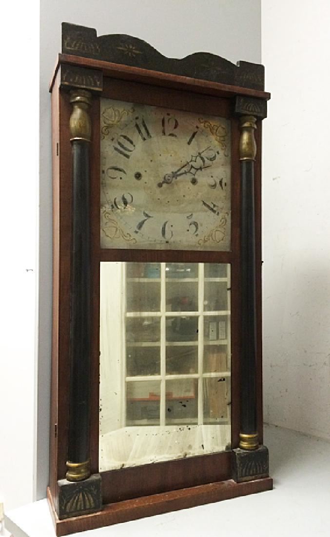 Burr & Chittenden Mahogany Looking Glass Shelf Clock, Lexington, Mass, with very uncommon groaner movement. Wooden works, stenciling at top and columns, full mirrored door, has nice beehive stenciling at top and bottom of columns, nice original weights and pendulum, keys, original dial with American sheild painted in all for corners in gold gilt, open diamond hands, striking bell at top of case.