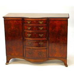 Burr walnut sideboard, the cross banded top above five centre bow fronted cockbeaded drawers flan…