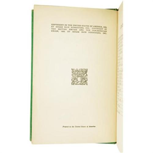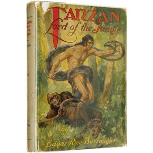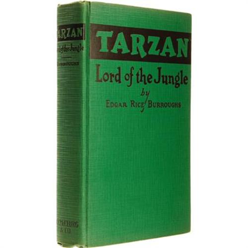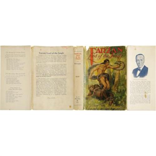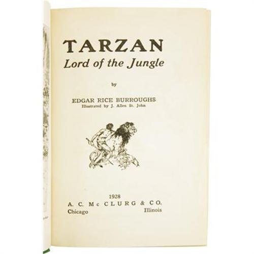 <B>Edgar Rice Burroughs: 1928 First State of <I>Tarzan, Lord of the Jungle</B></I>.</B></I> (Chicago: A. C. McClurg & Co., 1928), first edition, first state, 377 pages, green cloth binding with black lettering on the spine and front cover, 8vo (5" x 7.5"), original dust jacket (in protective Mylar). Illustrated by J. Allen St. John. <I>Tarzan, Lord of the Jungle</B></I> was the final Tarzan title published by McClurg, and in the first state, it is one of the scarcest McClurg Tarzans. The original print run consisted of four states totaling only 7,500 copies. It is not known exactly how many of each state were published, but in any case, it wasn't many. This is an exceedingly rare title, especially with the original dust jacket. The book is in very good condition, with minimal shelf wear, small remnants of tape residue at the endpapers, and slight toning of the textblock edges. The original dust jacket is good, with a 1" tear at the top of the front panel, minor chipping at the head of the spine, a small stain at the top of the rear panel, and evidence of tape repair at four spots on the inside of the jacket. Considering the rarity of both the first state book and the original jacket, this particular example of <I>Tarzan, Lord of the Jungle</B></I> is fit for any Burroughs collection.<BR><BR><b>Shipping:</b> Books & Catalogs (<a target="_blank" href="http://www.heritageauctions.com/common/shipping.php">view shipping information</a>)