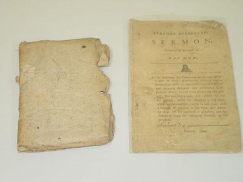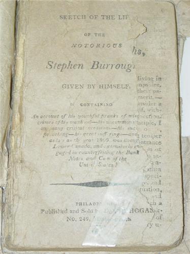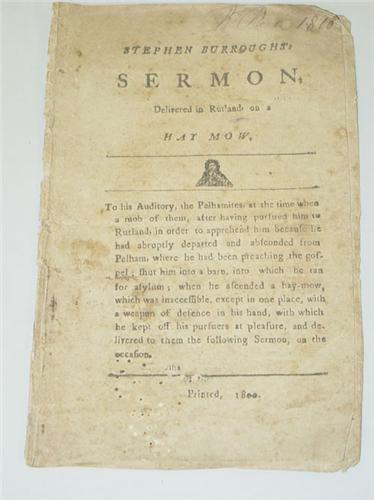 Burroughs, Stephen. A Group of 2 Booklets. Soft Cover. THESE ARE NOT EX-LIBRARY BOOKS. Stephen Burroughs (1765-1840) was an Amercan rogue, joining the army at the age of 14, deserting shortly afterwards and entering Dartmouth. He left school and went to sea as a privateer, then posed as the ship's physician. When back on land he assumed duties of a Congregational minister in Pelham, Mass, and then was arrested for counterfeiting. He escaped the Northampton Jail by burning it down ... and so on. ***Stephen Burroughs' Sermon, Delivered in Rutland on a Hay Mow (1800) no imprint. 12mo, 8pp, no boards, in fair condition, protected in a mylar cover. Paper age darkened, few small holes on title page, not affecting the text, corner curl. ***Sketch of the Life of the Notorious Stephen Burroughs, Given by Himself....(1832) Philadelphia: David Hogan. 16mo in paper wrap, portions of title page absent, with some pages absent - ending at page 98.