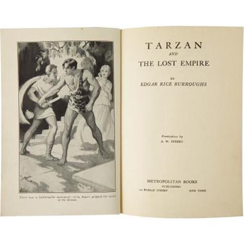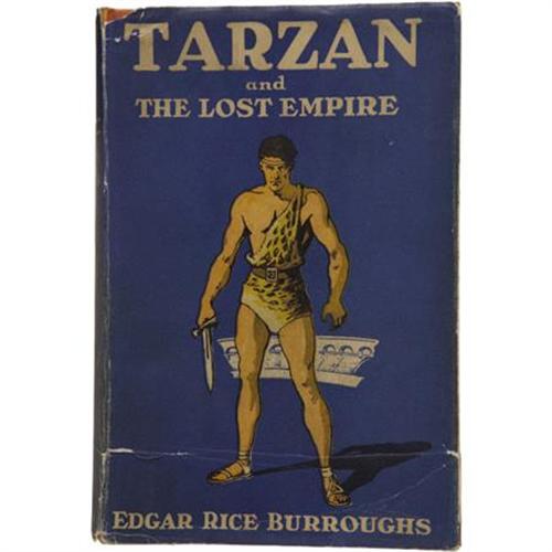<B>Edgar Rice Burroughs. </B></I><B><I>Tarzan and the Lost Empire</B></I></B></I><B>.</B></I> New York: Metropolitan Books, 1929.<BR><BR>First edition, first binding (Currey Priority A). Twelvemo. 313 pages. Frontis illustration by A. W. Sperry.<BR><BR>Publisher's orange cloth binding with black titles on the spine and front board. Corners bumped. General shelf wear with a few small nicks at the extremities. Internal contents slightly toned as usual. Former owner's book plate on the front pastedown. Dust jacket with a small area of loss at the upper right corner of the front panel not affecting title text. Vertical crease in lower third of front panel. Rubbing at the extremities. Shelf wear with light soiling. A handsome copy in very good condition. <I>From the Robert and Diane Yaspan Collection.</B></I><BR><BR><b>Shipping:</b> Books & Catalogs (<a target="_blank" href="http://www.heritageauctions.com/common/shipping.php">view shipping information</a>)