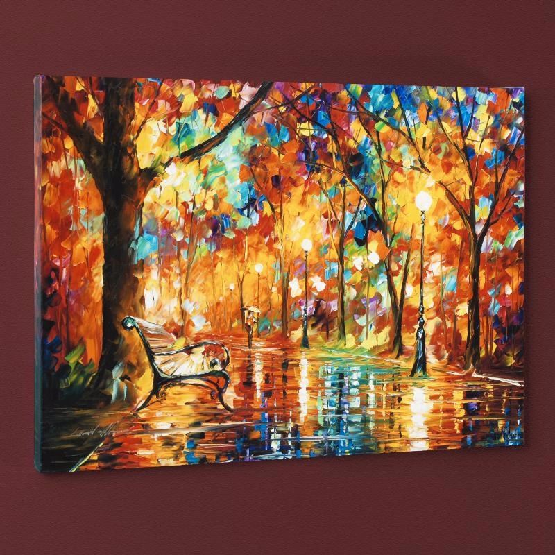 Leonid Afremov's masterful use of color and texture make his paintings unique collectibles that are sure to brighten any wall. "Burst of Autumn" is a limited edition giclee on stretched canvas, numbered in verso and bears Afremov's authorized signature. This piece comes gallery wrapped and ready to hang. Includes Certificate of Authenticity! Measures approx. 24" x 18" (image). Retail Price $500.00. PRICE INCUDES FREE SHIPPING IN THE U.S. - SHIPPING WILL BE ADDED TO YOUR INVOICE FOR ALL BUYERS OUTSIDE OF THE U.S.