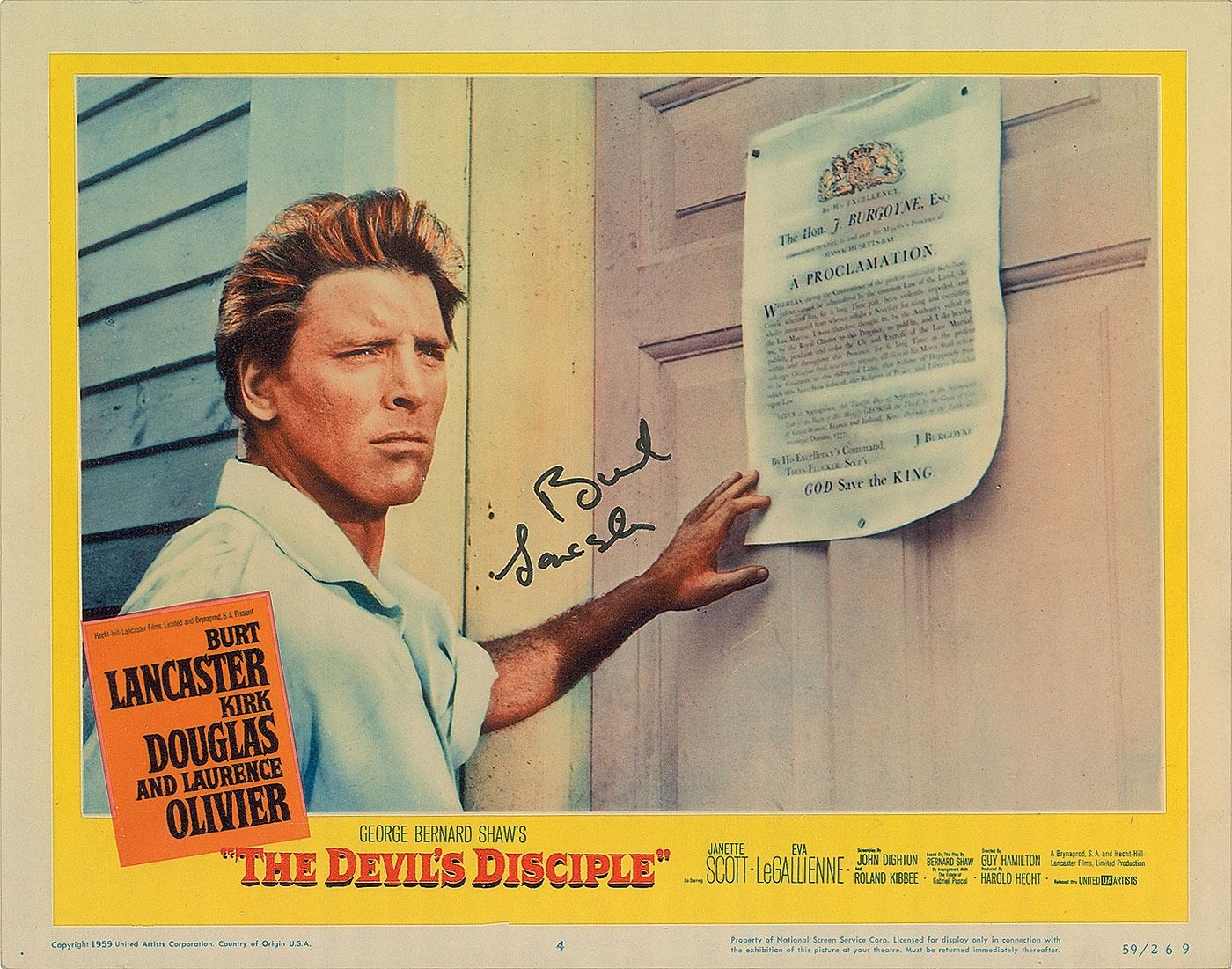 Color 14 x 11 lobby card for the 1959 film The Devil's Disciple, based on the play by George Bernard Shaw, signed in black felt tip by Lancaster. In fine condition. From the Harvey and Rhoda Kuflik Collection.