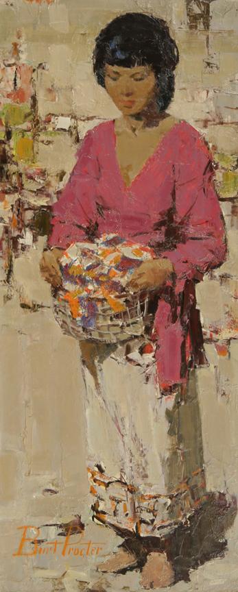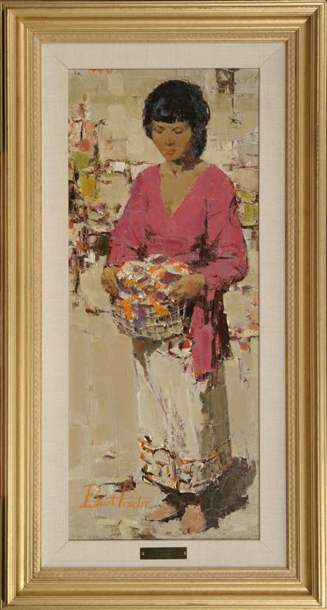 Burt Procter (1901-1980). Native Girl. 30 5/8" x 12 5/8" oil on board. Signed lower left. est ($6,000-9,000) For condition reports please visit: www.auctioninsantafe.com/cr2011.pdf