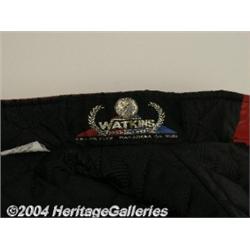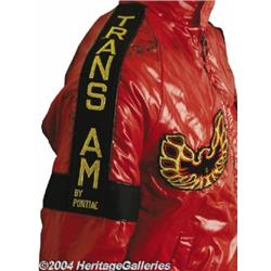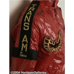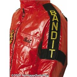 <B>Burt Reynolds Red Jacket</B></I>. Beginning his career in TV westerns in the 1960's, Burt Reynolds has become one of our beloved stars. Always a favorite with the fans, his starring role in "Smokey and the Bandit", filmed in 1977, has become a classic. This waist-length jacket has "Trans Am by Pontiac" emblazoned on the right shoulder, "Bandit" emblazoned on the left shoulder and "Burt" on the left front pocket. This shiny red jacket has some black smears near the top right shoulder, caused by wear. A wonderful association piece from the movie "Smokey and the Bandit". <BR><BR><B>Important notice:</B> Heritage usually auctions material at the rate of 200-250 lots per hour. On some occasions eBay Live bid software or the Internet may not be able to keep up with the pace of the auction. We recommend placing a realistic absentee bid now as insurance to avoid disappointment. Occasionally the auctioneer may eliminate or reject an eBay Live bid, and the auctioneer may also reopen a lot after the close of the eBay live bidding (usually because we missed an audience bid), and may reject your bid even if it shows you as the winning bidder. By bidding via eBay Live, you agree that Heritage may award the lot to another bidder at its sole discretion under the circumstances described above or any other reasonable circumstances. Since eBay bids are not shown to us until we open the lot on the floor, we treat those bids just like floor bids. In most cases the floor responds before the eBay bid is presented to us, due to Internet lag time, so for consistency we have made it a policy that floor bids are always considered first over tie eBay live bids. Also please note that all Heritage lots purchased through eBay Live carry a 24.5% Buyer's Premium. Please make sure you read the Terms and Conditions before you bid.