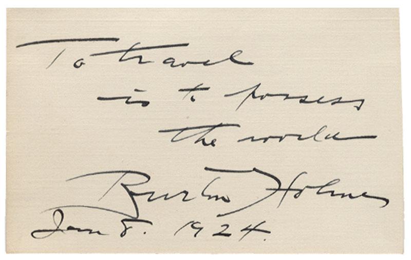 Burton Holmes (1870 – 1958). American traveler, photographer and filmmaker, who coined the term "travelogue". Card Signed with sentiment. Jan. 8, 1924. 5" x 3 1/8". "To travel is to possess the world, Burton Holmes, Jan 8, 1924." Excellent.
