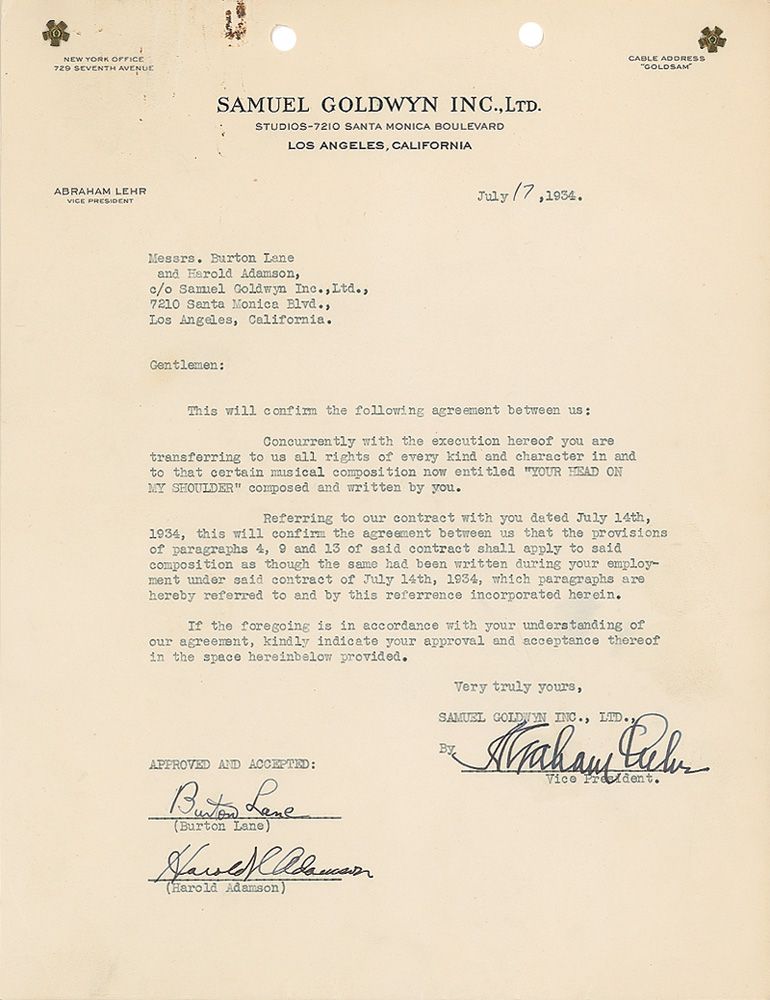 DS, one page, 8.5 x 11, July 17, 1934. Agreement between Lane, Adamson, and Samuel Goldwyn, Inc., in which Burton and Lane transfer all their rights to the composition entitled ‘Your Head on My Shoulder.’ Signed at the conclusion by Burton and Lane as well as by a Goldwyn executive. In fine condition, with punch holes and rust marks to top edge and some scattered light toning.