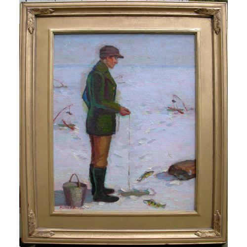 Wisconsin Ice fisherman by Burton Boundey a contemporary of John Steinbeck. 1879-1962 , Size 20"X16" a vertical image in new, custom, period frame. "Ice Boats" Wisconsin Painting recently sold at auction for $22,000. Burton Boundey was a prolific painter and muralist active in California during the early twentieth century. He was a native of Wisconsin, born in the town of Oconomowoc in 1879. Boundey pursued his early art education in Chicago, Illinois, at the Art Institute of Chicago and Smith Academy. He then went to New York City where he was a pupil of Robert Henri and George Bellows. In 1927 he moved to Monterey, California, and promptly opened a studio there. He taught at the nearby Carmel Art Institute and was a member of the American Artists Professional League. He painted marines and coastal scenes in and around Carmel and Monterey and was a skilled watercolorist and oil painter. His artwork was exhibited at the Carmel Art Association, the Oakland Art Gallery, the Santa Cruz Art League, the San Francisco Art Association and the Pasadena Art Institute. Boundey died in his Pacific Grove, California, home in 1962.