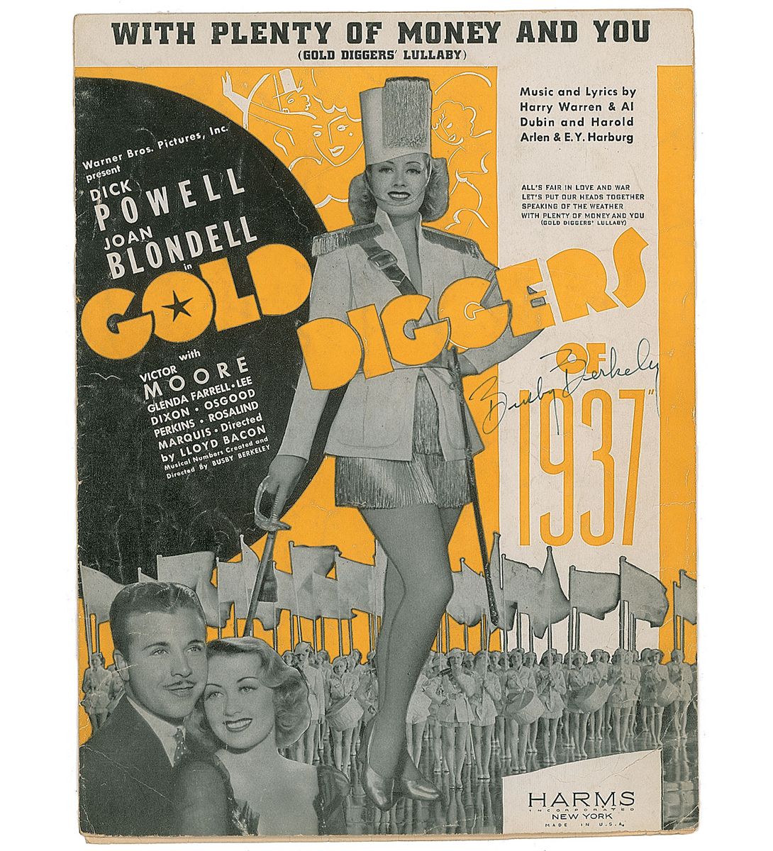 Vintage sheet music for ‘With Plenty of Money and You,’ from Gold Diggers, 9 x 12, five pages, signed on the front cover in fountain pen by Berkeley. Scattered creases and soiling to cover, and creasing, toning, and multiple tape repairs to inside pages,