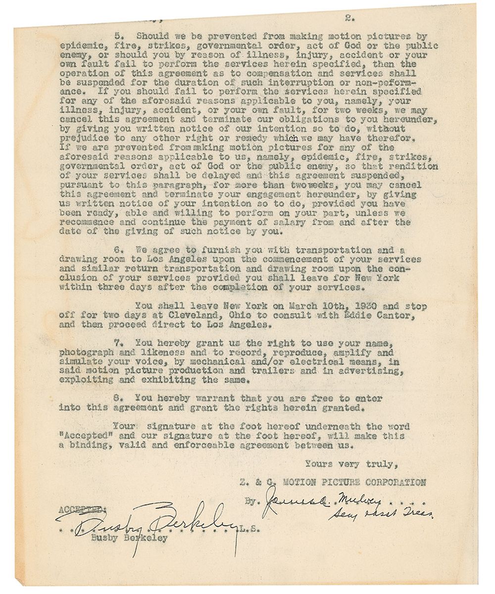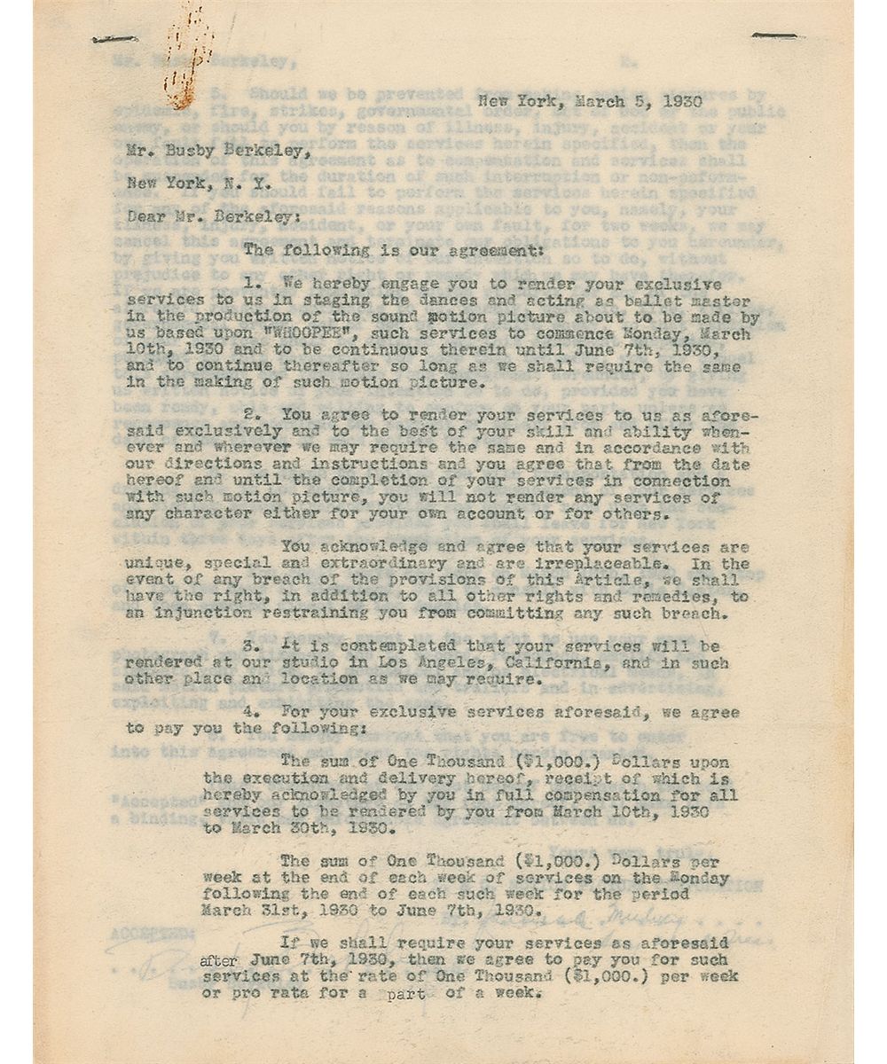 Iconic director and choreographer (1895–1976) whose lavish, elaborate dance numbers defined the look of movie musicals in the 1930s and 1940s. DS two pages, 8.5 x 11, March 5, 1930. Agreement between Berkeley and the Z. and G. Motion Picture Corporation engaging the services of Berkeley “in staging the dances and acting as ballet master in the production of the sound motion picture about to be made by us based upon ‘Whoopee,’” for a salary of $1000 per week. Signed on the second page by Berkeley. Expected document wear and a rusty paperclip mark to top edge, otherwise fine condition.