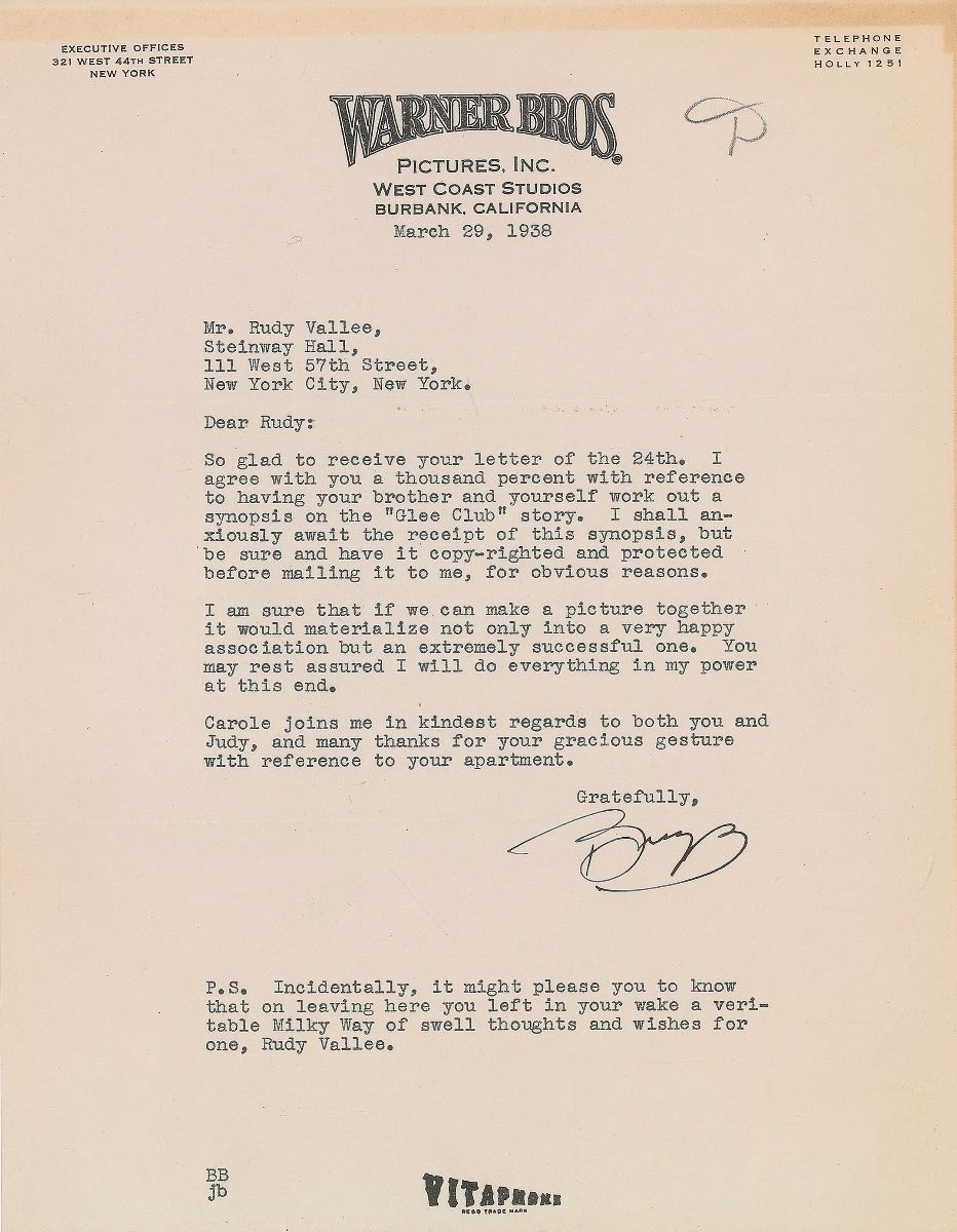 TLS signed “Busby,” one page, 8.5 x 11, Warner Bros. Pictures Inc. letterhead, March 29, 1938. Letter to performer and original teen heartthrob Rudy Vallee, in part: “I agree with you a thousand percent with reference to having your brother and yourself work out a synopsis on the ‘Glee Club’ story. I shall anxiously await the receipt of this synopsis, but be sure and have it copy-righted and protected before mailing it to me, for obvious reasons. I am sure that if we can make a picture together it would materialize not only into a very happy association but an extremely successful one. You may rest assured I will do everything in my power at this end.” Berkeley adds a brief postscript, “Incidentally, it might please you to know that on leaving here you left in your wake a veritable Milky Way of swell thoughts and wishes for one, Rudy Vallee.” In fine condition, with expected horizontal mailing folds (one touching the top of the signature) and toning to top and right edges from previous display.