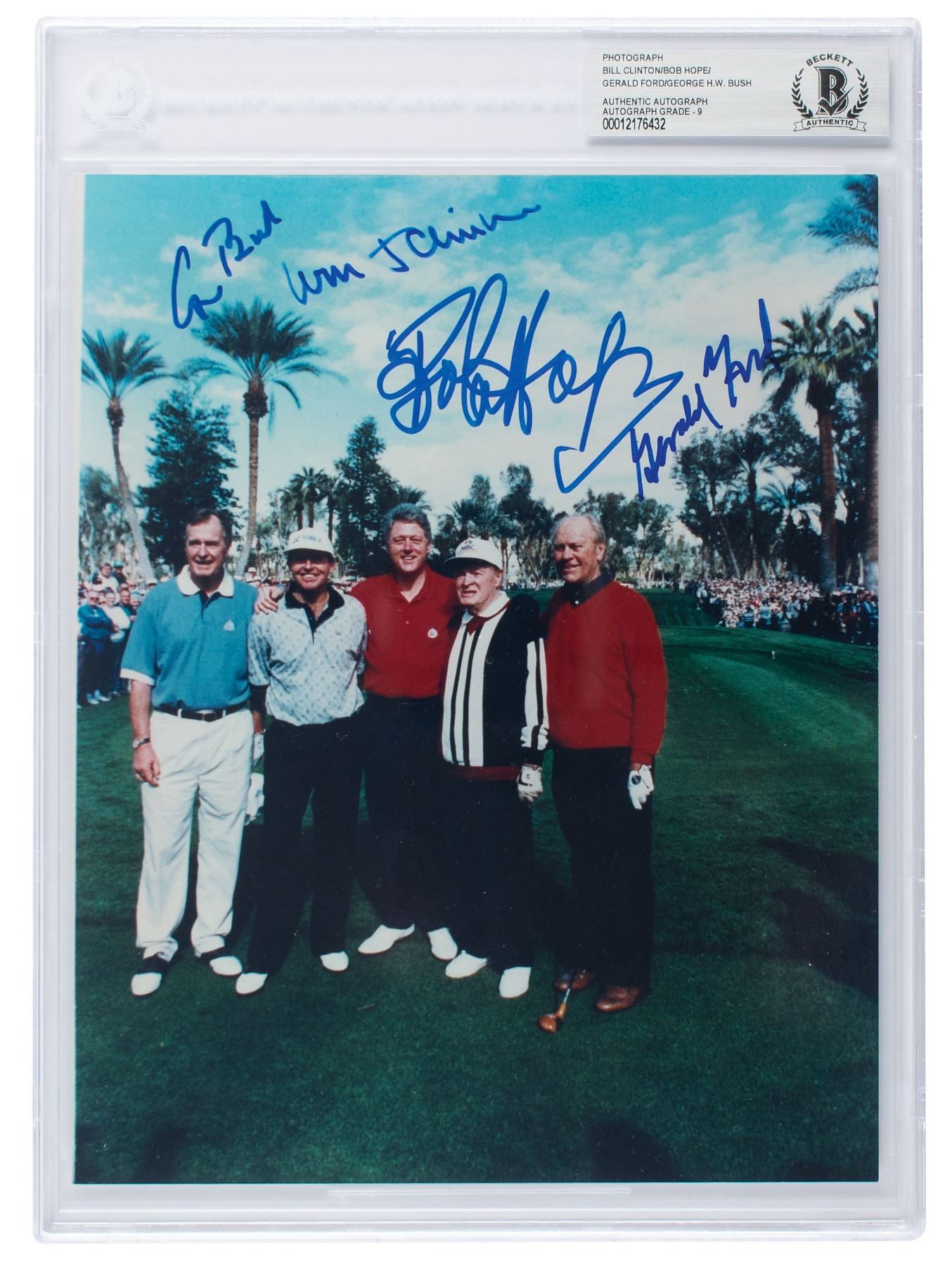 Uncommon color satin-finish 8 x 10 photo of President Bill Clinton posing with Bob Hope and former Presidents George Bush and Gerald Ford at the 1995 Bob Hope Chrysler Classic, signed in blue felt tip, "George Bush," "Wm. J. Clinton," "Gerald Ford," and "Bob Hope." In very fine condition. Encapsulated and graded by Beckett as "9." Accompanied by a full letter of authenticity from Beckett Authentication Services.