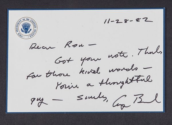 Bush, George H. W (1924 -) 24th President of the United States (1989-1993). Autograph note signed as Vice President, on notecard with Vice-President of the United States seal, 6¼ x 4¼ in. (Washington), 28 November 1982. "Dear Ron [President Reagan?] Got your note. Thanks for those kind words. You're a thoughtful guy. Sincerely, George Bush."