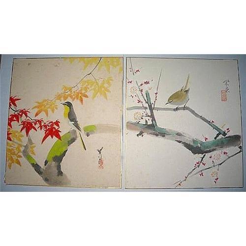 A gorgeous kacho-e (bird and flower painting) diptych collaboration by two of Japan's best 19th Century artists. Eisen is the better known of the two, but Koki proves that history made a mistake in neglecting him. He proves himself a respectful collaborator and at the same time equal to the master, Eisen. History is making amends by giving us this unforgettable collaboration. 10.5 x 9.5 inches, 27 x 24 cm (each painting)