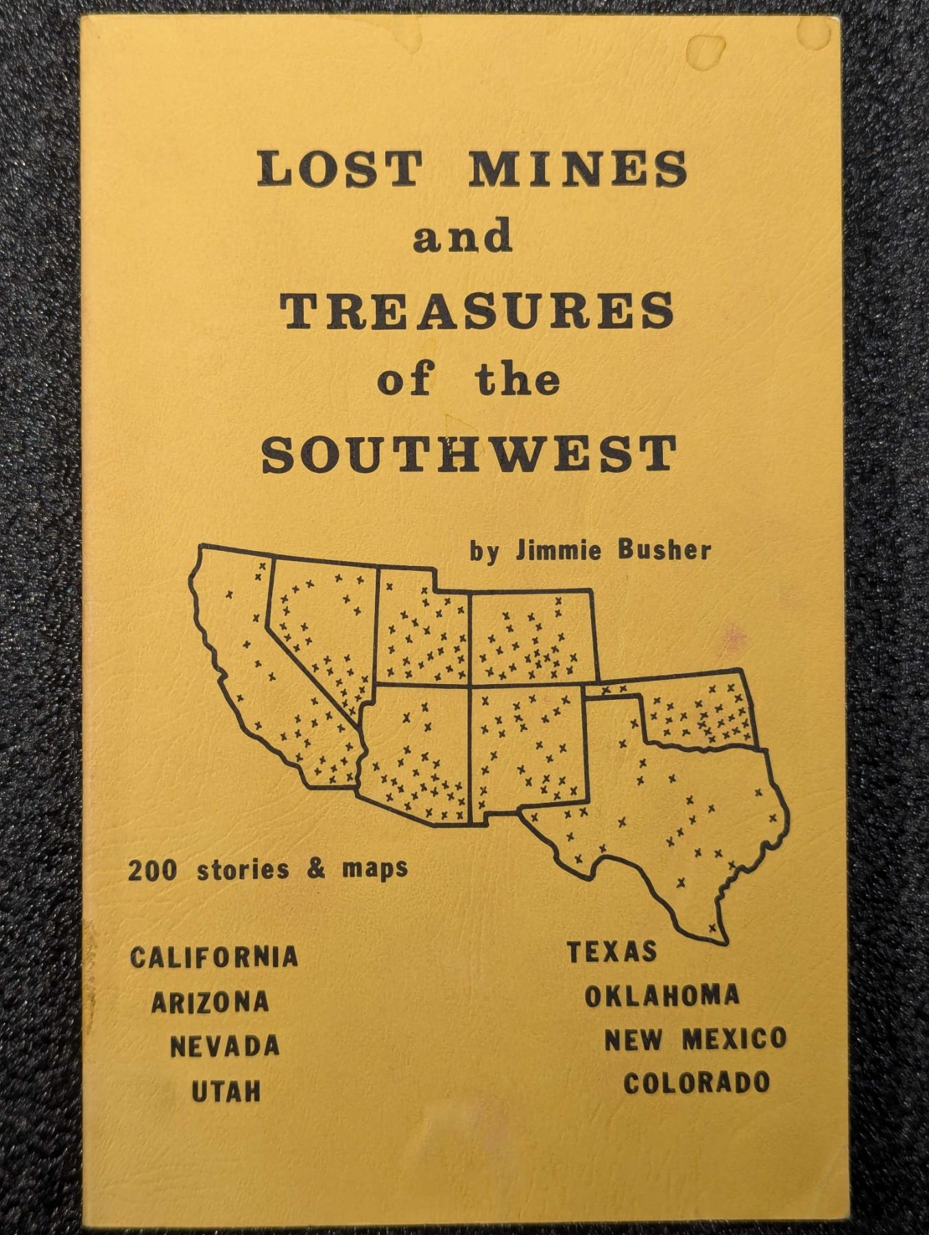 Busher, Jimmie. LOST MINES AND TREASURES OF THE SOUTHWEST. Treasure Guide Publishing Co., Mesilla Park. 1975. 12mo. unpaginated pages. original ochre printed card covers. Maps. English text. Fine. Includes 200 stories and maps covering California, Arizona, Nevada, Utah, Texas, New Mexicoand Colorado. Lot weight: 0 lbs 8oz. Subject(s): Buried Treasure, Lost Mines.