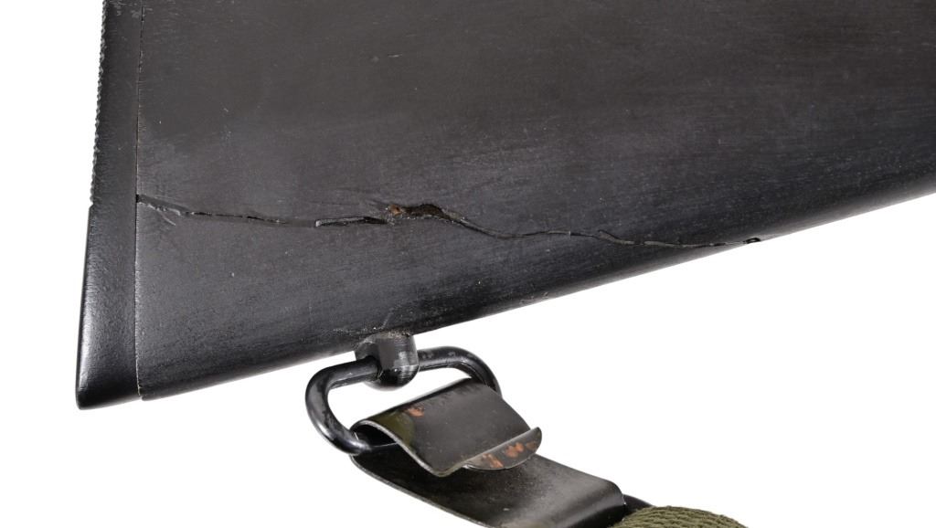 Early Bushmaster Assault Rifle S/N F00492. Very good condition, action and bore. Cracked butt stock. Barrel measures 20"