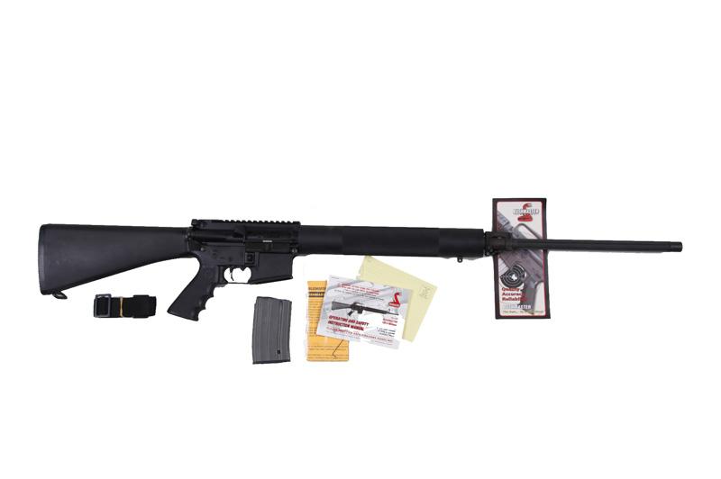 Bushmaster Mdl XM15-2ES Cal .223/5.56mm SN:L149254, Excellent semi-auto Competition rifle patterned after the M16 military rifle. Matte black finish, polymer stock and pebbled pistol grip with aluminum checkered hand guard, 26" fluted V-Match barrel withSN:L149254, Excellent semi-auto Competition rifle patterned after the M16 military rifle. Matte black finish, polymer stock and pebbled pistol grip with aluminum checkered hand guard, 26" fluted V-Match barrel with Picatinny rail mountedon receiver for sight installation, 2 stage trigger, sling swivels installed but no sling. Good bore and action. Condition: Excellent to perfect with no sign of use. Includes 1 magazine and belt with instruction manual.