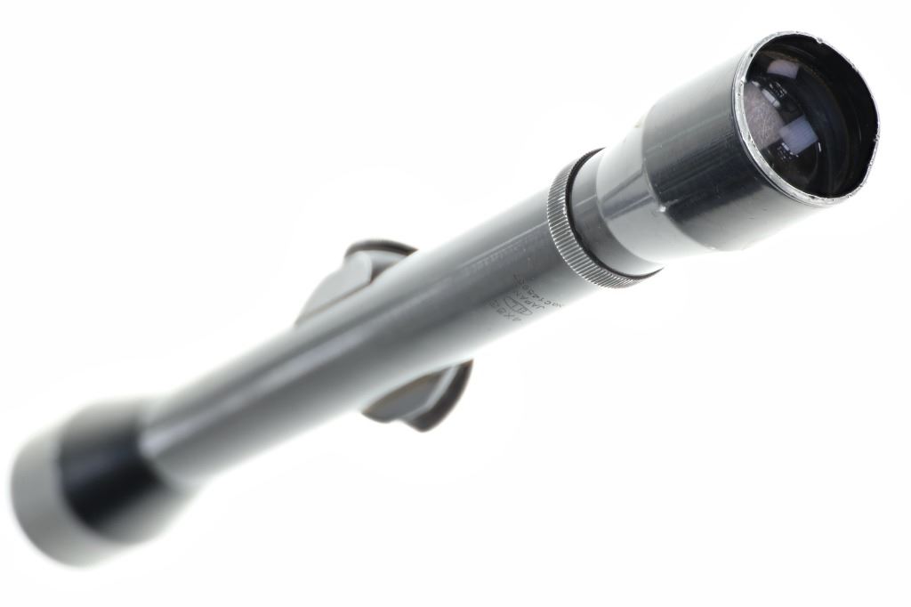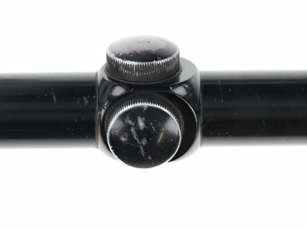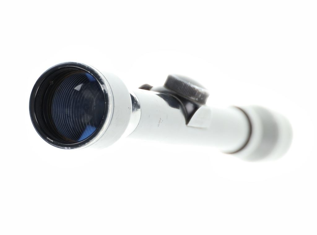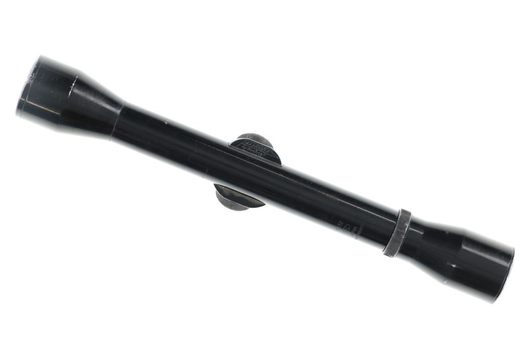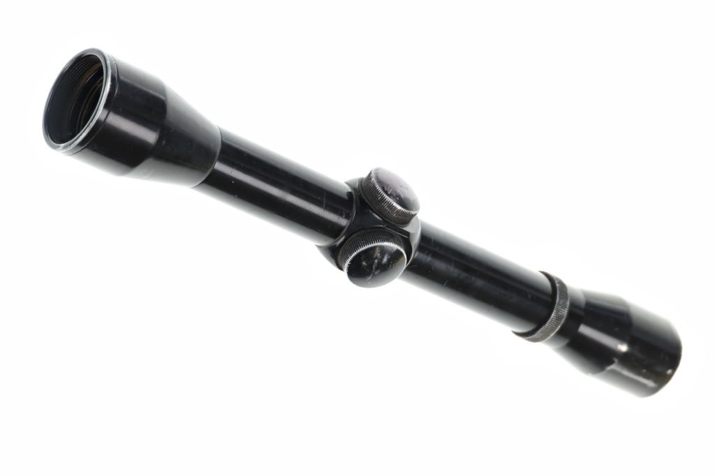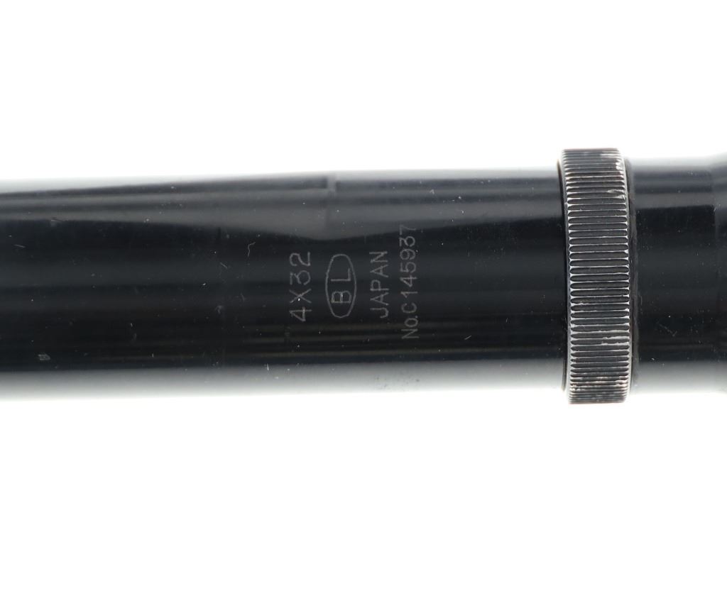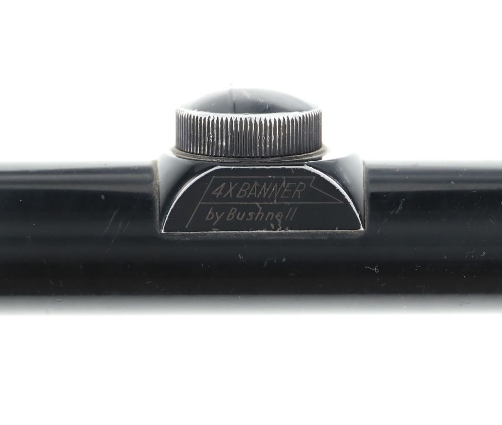 Featured in this lot is this 1960-80s 4x Banner 4x32 rifle scope made by Bushnell. After returning from his honeymoon in Japan with two crates of binoculars, David P. Bushnell founded the Bushnell optics company in 1948 and began selling binoculars by mail order. Bushnell was an American businessman who introduced affordable precision binoculars to the middle class for the first time. He was also among the first businessmen from Southern California to recognize the potential of promoting products made in Asia at a lower cost in the US market. This rifle scope shows a knob on the top and one on the right for adjustments and zeroing the scope in. Near the top knob it reads, "4x Banner by Bushnell", while the bottom is marked, "4x32 BL Japan No. C145937". The cross hair is clean and clearly visible through the scope. The front of the scope has been slightly bent but does not effect the view port. Shows slight cosmetic wear from its age and use over the years but no signs of major damage is noted. The scope measures 11 11/16" L x 1 1/2" H and weighs 8 ounces.