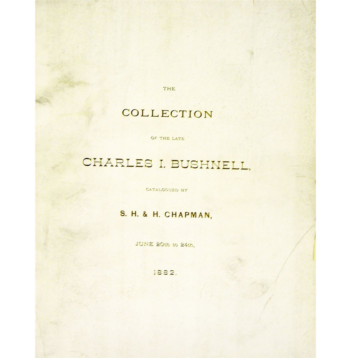 Chapman, S.H. and H. CATALOGUE OF THE CELEBRATED AND VALUABLE COLLECTION OF AMERICAN COINS AND MEDALS OF THE LATE CHARLES I. BUSHNELL, ESQ. OF NEW YORK. New York: Bangs, June 20-24, 1882. 4to, original gilt-printed white paper covers. 136, 10, (2) pages; 3000 lots. Original prices realized list included. Set of 12 reprint plates also included. Front cover and spine a bit worn, rear lacking. Still near fine. One of the landmarks of American numismatic literature. The Bushnell collection was the stuff of fables, being well-known, yet little seen. After Bushnell's death in 1880, a number of prominent dealers attempted to obtain the collection, but it was the Chapman brothers who, to the surprise of many, made off with the prize. The sumptuous catalogue they prepared was heavily criticized, most prominently by Ed. Frossard in Numisma, who gleefully recorded a number of errors the brothers made. Errors aside, the catalogue is a masterpiece, and a fitting homage to the collection. The set of reprint plates is a welcome addition. A good candidate for binding. Adams 9 (A+ overall, rated A in large cents, colonials, medals, tokens, patterns, Washingtonia and comments). Davis 180.