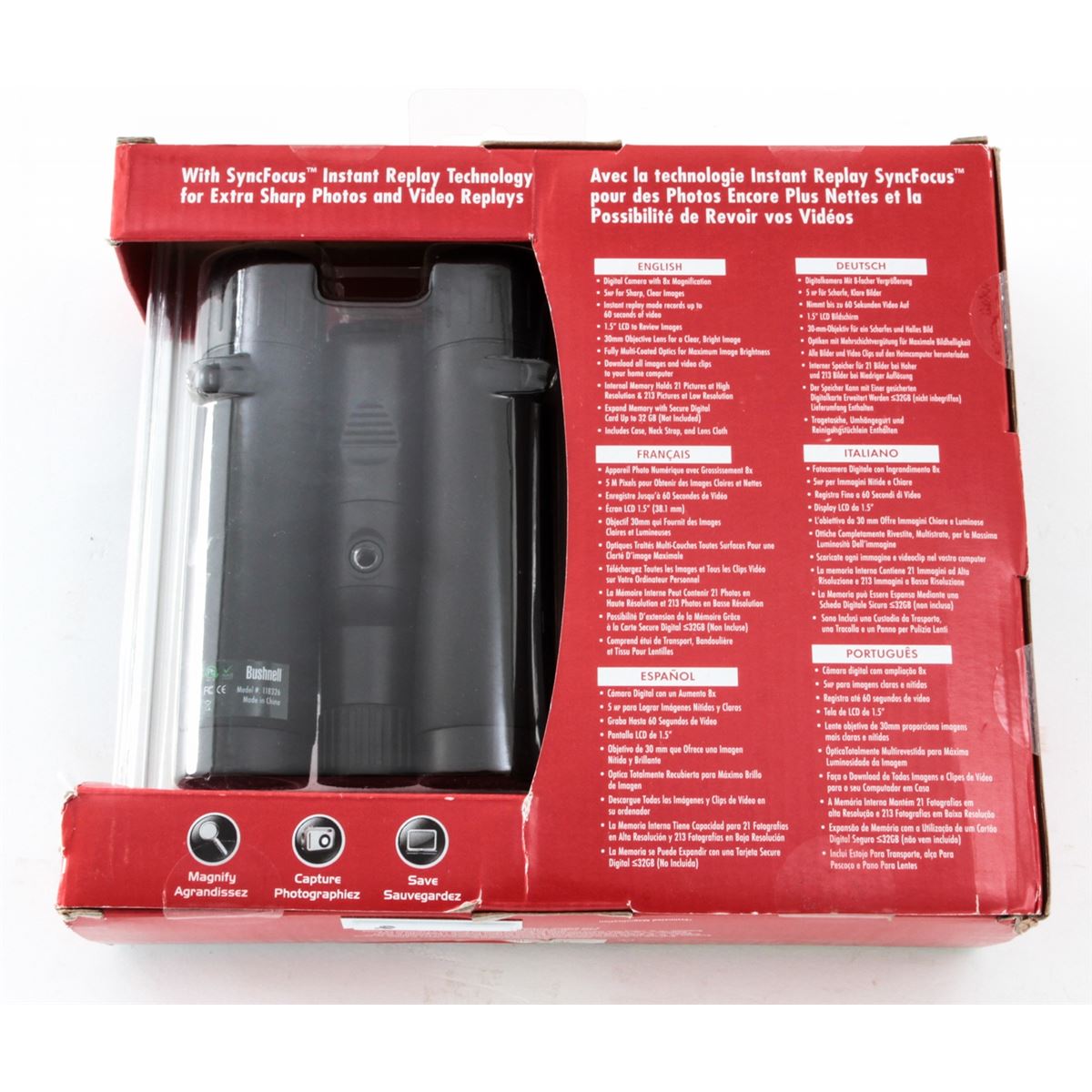 Bushnell Image View Digital Camera Binoculars, 8x30, 5 MP camera, instant replay mode records up to 60 seconds of video, 1.5'' LCD to review images, 30mm objective lens, full multi-coated optics for maximum image brightness. Brand new in original packaging, with case, neck strap and lens cloth. Retails @ $259.95. Est.: $100-$200. (Field Time)