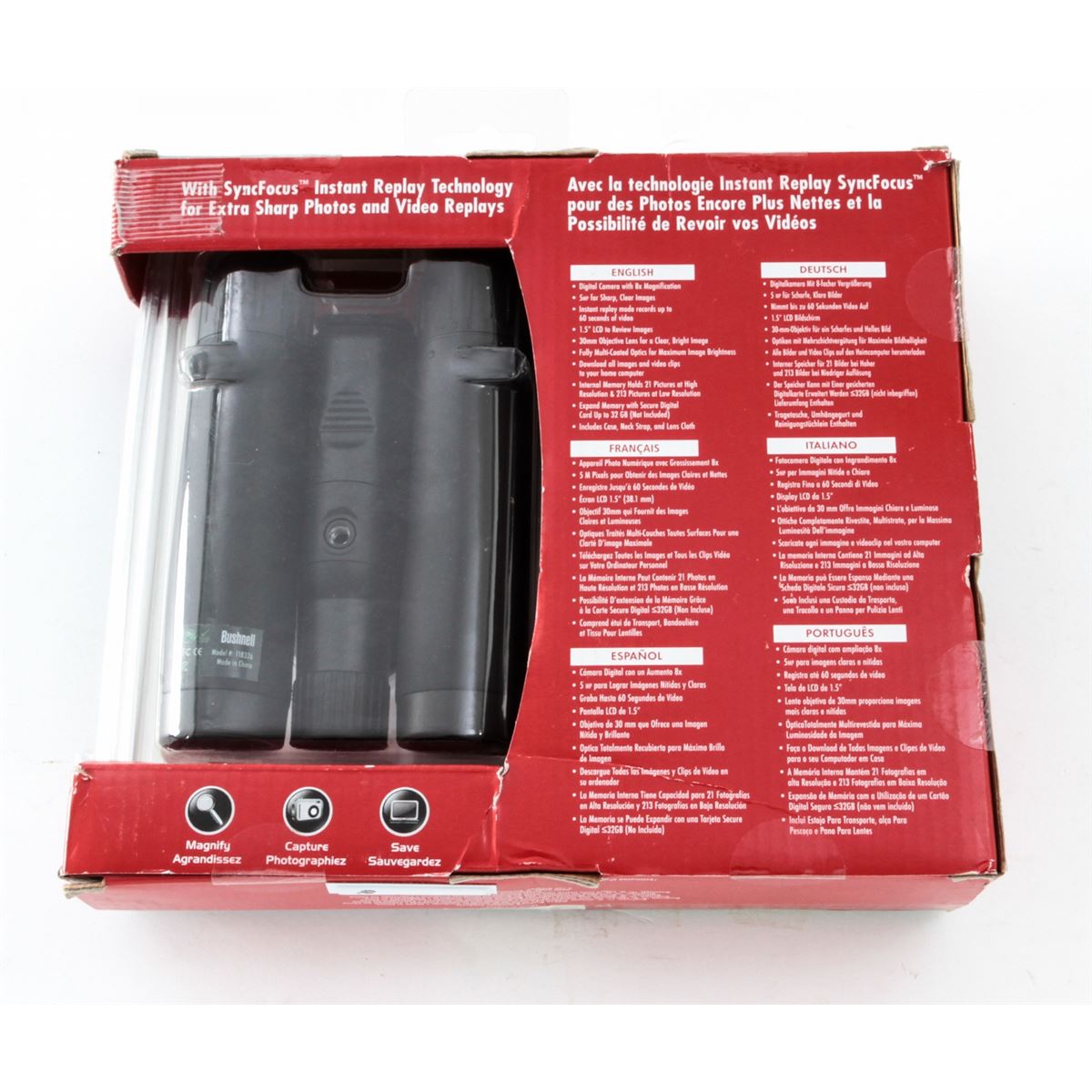 Bushnell Image View Digital Camera Binoculars, 8x30, 5 MP camera, instant replay mode records up to 60 seconds of video, 1.5'' LCD to review images, 30mm objective lens, full multi-foated optics for maximum iage brightness. Brand new in original packaging, with case, neck strap and lens cloth. Retails @ $259.95. Est.: $100-$200. (Field Time)