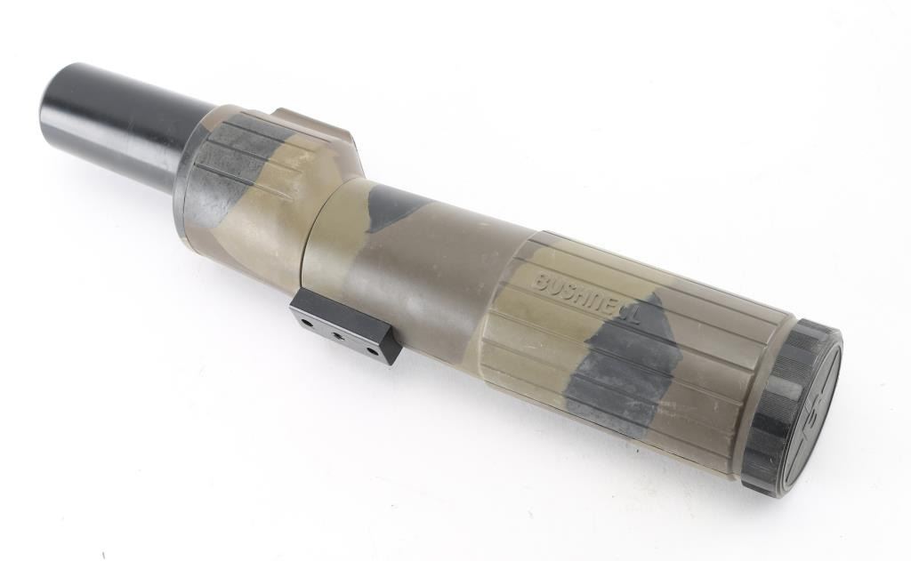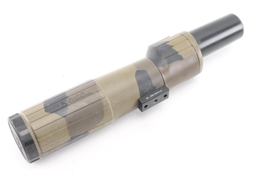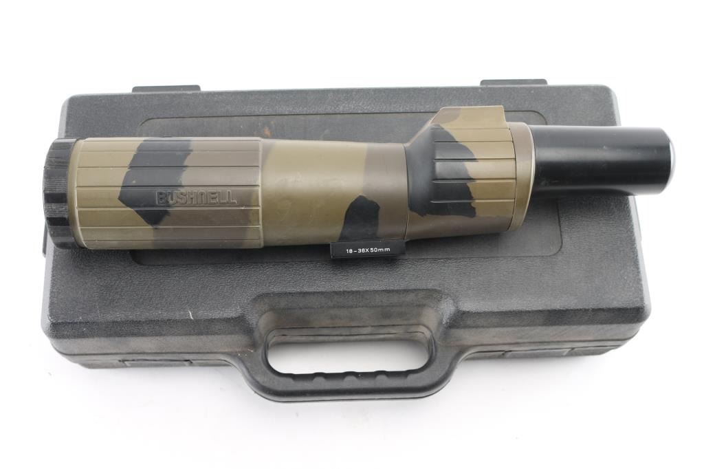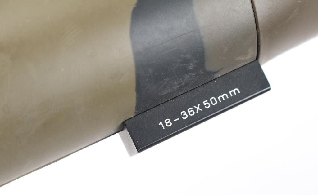 18-36x50mm. Camo colored and rubber armored. Comes with Lens covers and black hard plastic case.