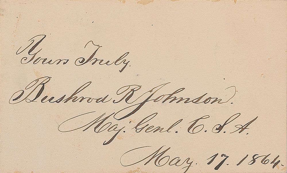 Confederate general who commanded a brigade of the Army of Mississippi at the Battle of Shiloh (1817–1880). Ink signature, “Yours truly, Bushrod R. Johnson, Maj. Genl. C. S. A., May 17, 1864,” on an off-white 4 x 2.5 card. In fine condition.