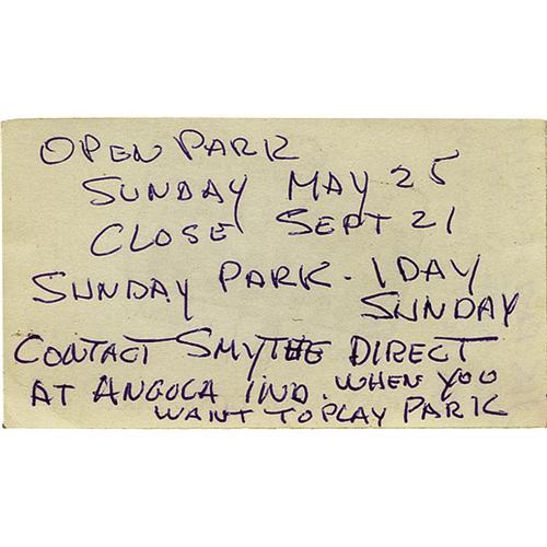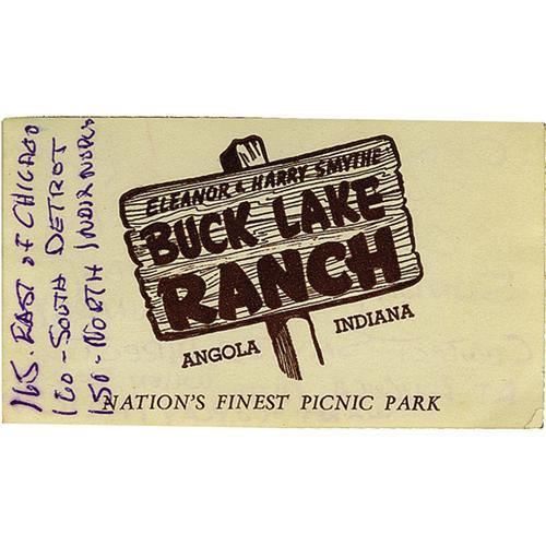 <B>Business Card with Handwritten Notes by Holly.</B></I> A business card for the Buck Lake Ranch picnic park in Angola, Indiana, with handwritten directions on the front and gig notes on the back in Buddy's handwriting in purple ink. In Excellent condition. <I>With COA from Maria Elena Holly.</B></I>