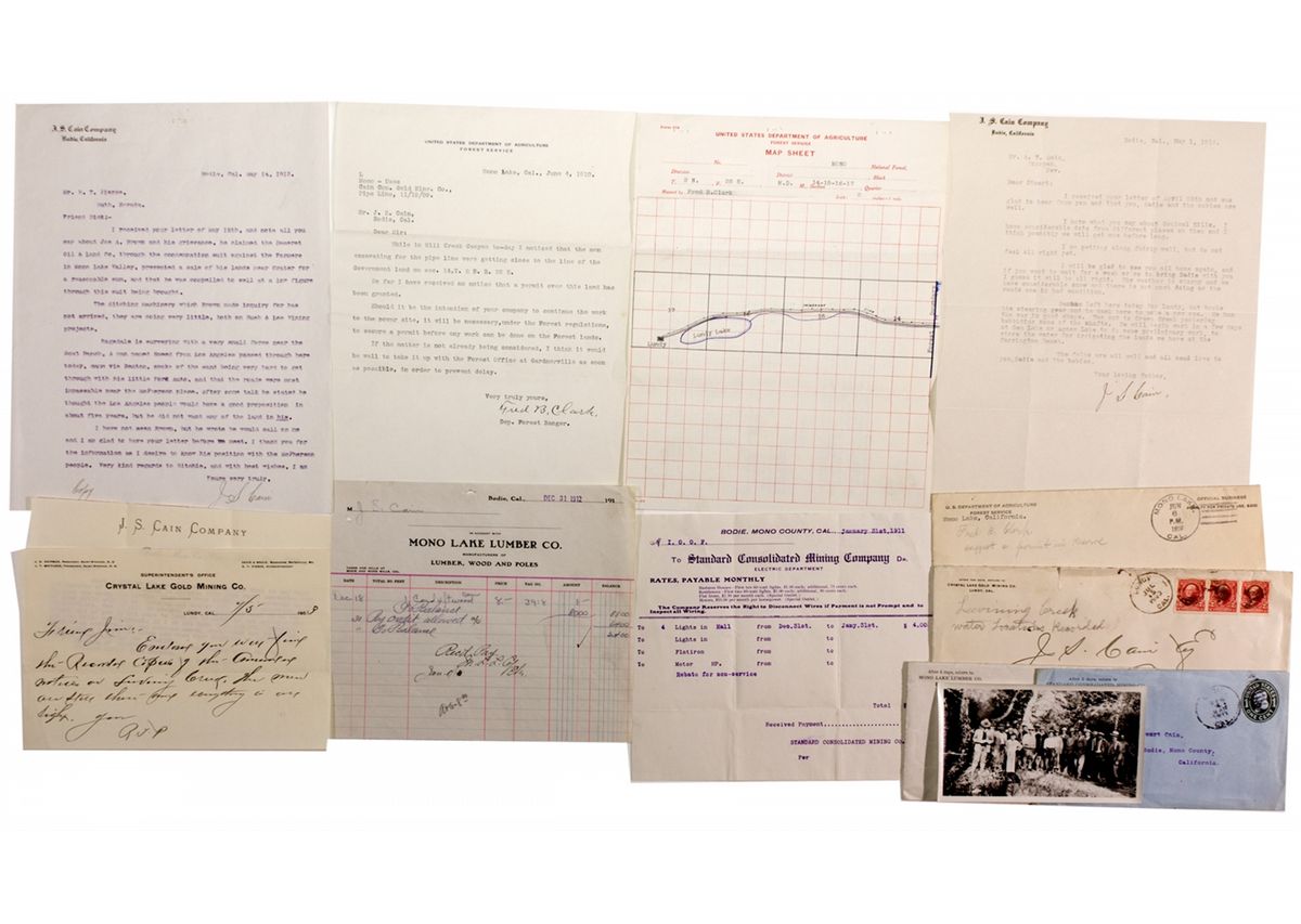 Fourteen separate pieces of business correspondence from 1903 to 1915. The collection includes three J. S. Cain Company letterheads (1913, 1915, 1903); a 1911 cover with cc from the Standard Consolidated Mining Company addressed to J. S. Cain, Bodie cancel, includes a 1911 Standard Consolidated Mining Company billhead; 1912 Mono Lake Lumber Co. billhead; a Mono Lake Lumber Company cover from 1913 with Bodie cancel and inside photograph of people in a forest setting; a 1903 Crystal Lake Gold Mining Co., Lundy, CA, letterhead from Crystal Lake Mining Company Superintendent R. T. Pierce with hand-canceled stamps on cover addressed to J. S. Cain Company, Bodie, Cal., Mono Co., sealing wax stamp intact reads CRYSTAL LAKE GOLD MINING CO. LUNDY CAL.; a 1910 United States Department of Agriculture Forest Service letterhead to J. S. Cain concerning excavation for a pipe line getting too close to government land, cover addressed to J. S. Cain hand canceled Mono Lake; and a United States Department of Agriculture Forest Service Special Use Permit granting Lundy Cyanide & Development Co. of Lundy, CA permission to maintain and operate a non-commercial telephone line, with accompanying U.S. Dept. Of Agriculture Forest Service map sheet. -59277