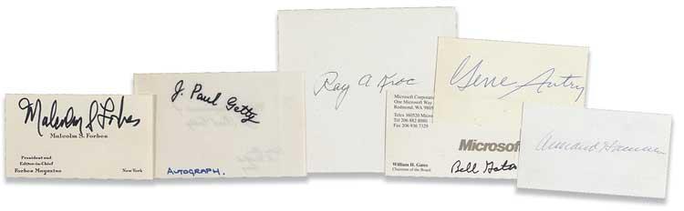 Ink and felt tip signatures of Bill Gates, J. Paul Getty, Gene Autry, Malcolm Forbes, Armand Hammer, and Ray Krock on individual personal business cards or slips. In fine overall condition. RRAuction COA.