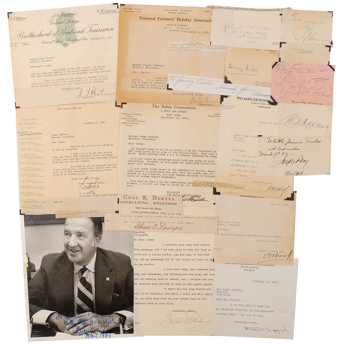 Eighteen items consisting of signatures and TLSs, on various size slips, cards, and sheets, each signed by a renowned businessman. Signers are: John Pillsbury, Charles Hires, Henry Ford II (2), Norman DeVaux, Charles Duryea, Zack T. Miller, Zalmon Simmons, Jakob Raskob, Robert Dollar, W. A. Fisher, Walter Gifford, Benjamin Affleck, Milo Reno, Joseph P. Day, Alexander Whitney, Arthur B. Adler, and Robert Wood. In very good condition, with various scattered toning, folds and trimmed edges to letters, and mounting remnants to many of the corners.