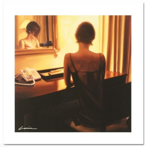 Soft light and intimate settings focus on the familiar yet unattainable in Carrie Graber's remarkable artwork. "Business and Pleasure" is a limited edition giclee on canvas by Graber, numbered and hand signed by the artist! Includes Certificate of Authenticity! Measures approx. 16" x 16" (image).