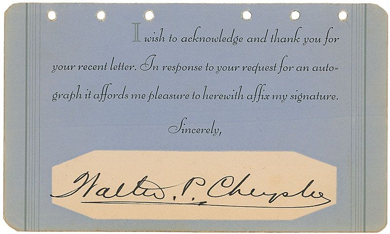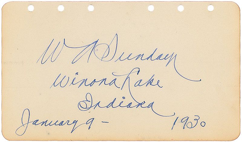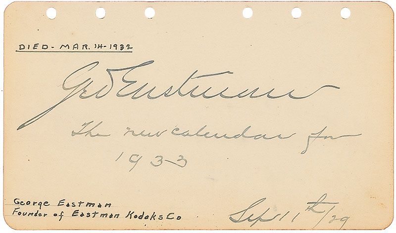 Softcover autograph book, 4 x 6.25, signed inside on individual pages or affixed slips or letters in ink by 28 notable business and religious leaders, predominately circa 1930s. Signers are: George Eastman, Walter Chrysler, Billy Sunday, Aimee Semple McPherson, Charles M. Schwab, William Wallace Atterbury, Walter C. Teagle, William Green, Edward H. H. Simmons, Daniel Willard, H. R. Dowd, Charles H. ‘Tom’ Sawyer, R. O. Goodykoontz, Henry van Dyke, Harry Emerson Fosdick, S. Parkes Cadman, James Cannon, Jr., John Roach Straton, Stephen Samuel Wise, John G. Murray, William T. Manning, Maurice B. Alexander, Edward Higgins, John J. Swint, Michael Joseph Curley, William Cardinal O'Connell, Patrick Cardinal Hayes, and Robert B. Meyner. In overall fine condition.