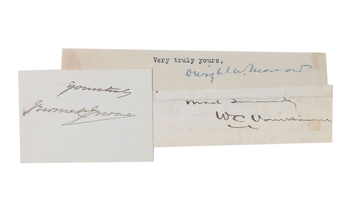 Ink signatures of Jerome K. Jerome, Dwight Whitney Morrow, and William C. Van Horne on off-white clipped slips and cards. In very good condition.