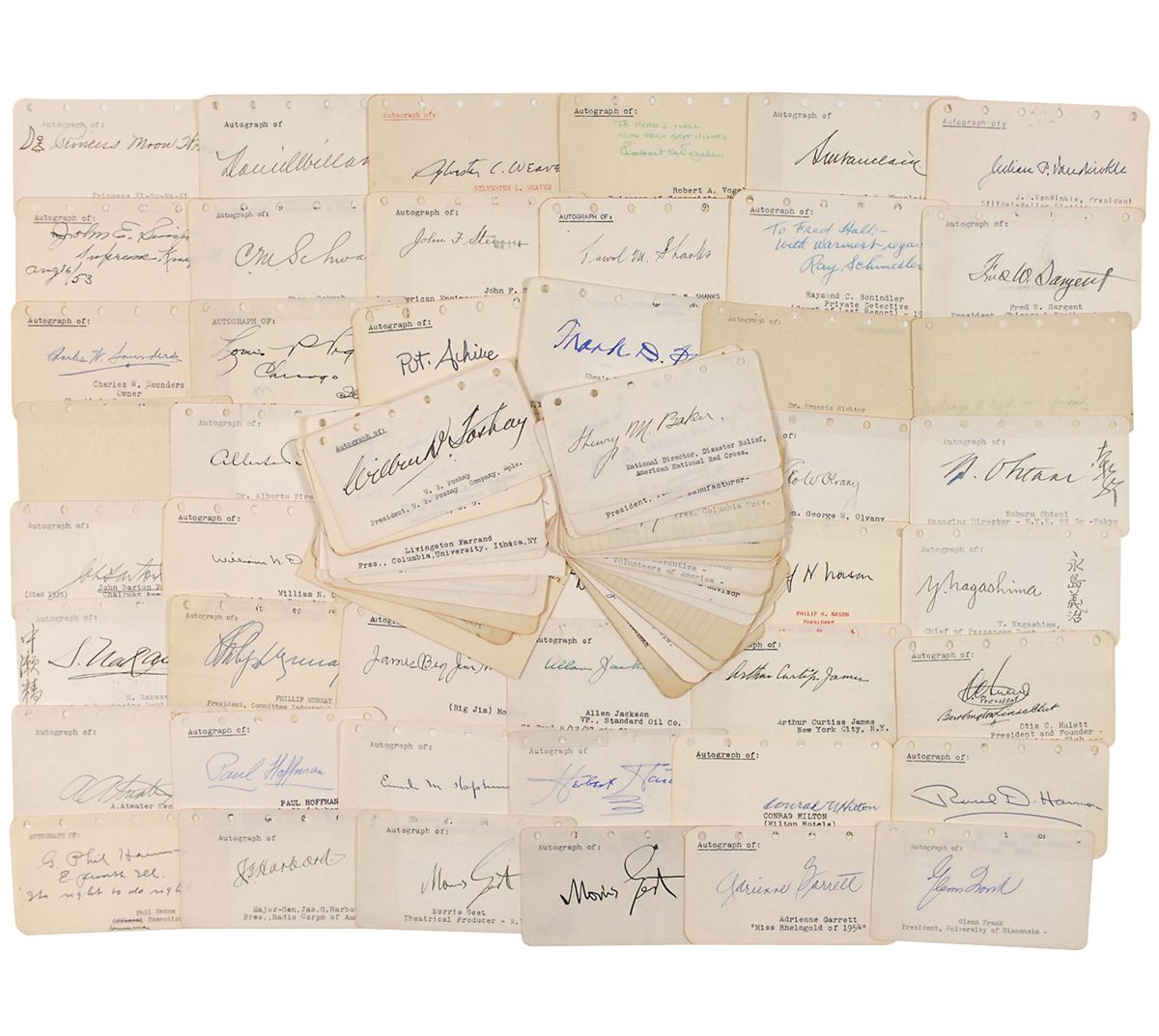 Collection of approximately 110 signatures of various businessmen and otherwise notable figures, the vast majority in ink with a few in pencil, primarily on individual off-white 4.5 x 2.5 pages, some lined. Signers include: Dale Carnegie, Chauncey Depew, Marshall Field III, William Green, Conrad Hilton, Archibald MacLeish, George Meany, J. C. Penney, Charles Schwab, and Adolph Zukor. In overall fine condition, with light edge toning.