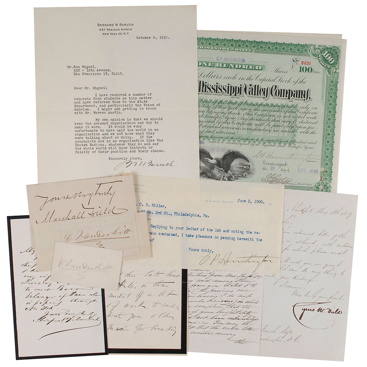 Collection of ten items, each signed by a prominent businessman or philanthropist, including: Collis P. Huntington (stock certificate and TLS), Cornelius Vanderbilt (two signatures), Marshall Field (signature), August Belmont (ALS), August Belmont, Jr. (ALS), Cyrus W. Field (LS), George Peabody (ALS), and Bernard Baruch (TLS). In overall fine condition. Accompanied by seven unsigned engraved portraits and photos, many bearing printed facsimile signatures.