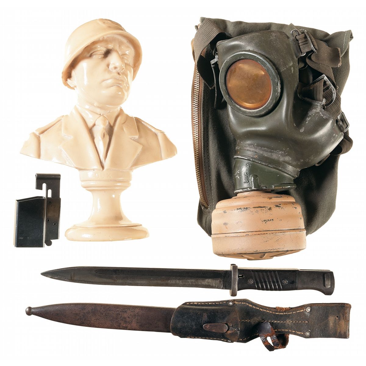 1) Plaster bust of Mussolini, 10 3/4" high, 8" wide at the shoulders. Excellent. 2) Para Gas Mask with canvas bag. Good. 3) K-98 bayonet with metal scabbard and leather hanger. Good with part of securing strap absent, tear in the hanger (front) and some oxidation on the scabbard. 4) MP-40 loading tool. Very good.