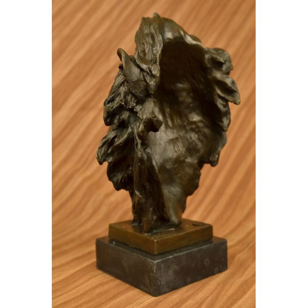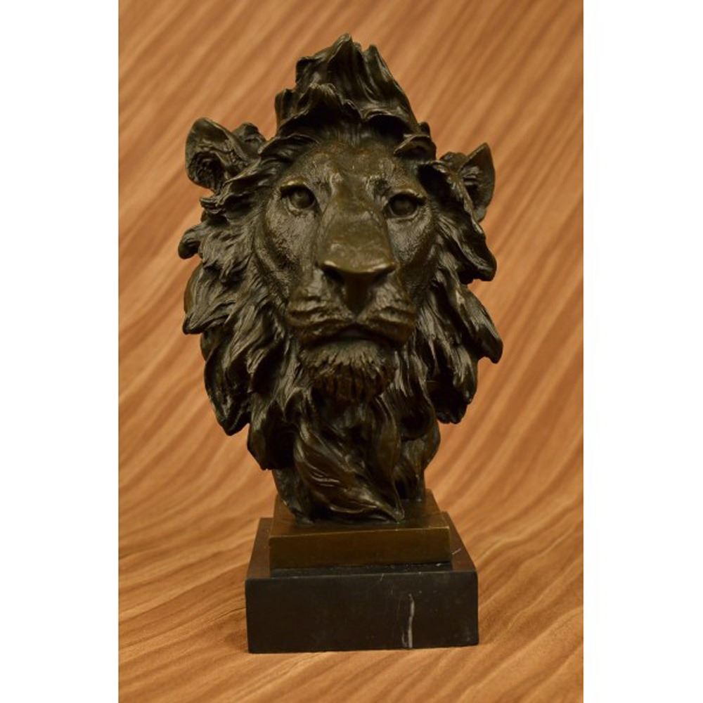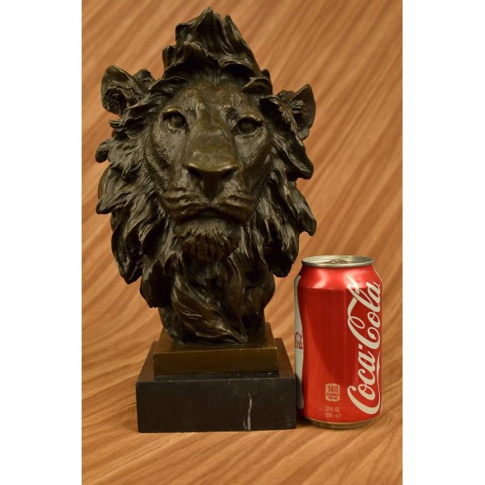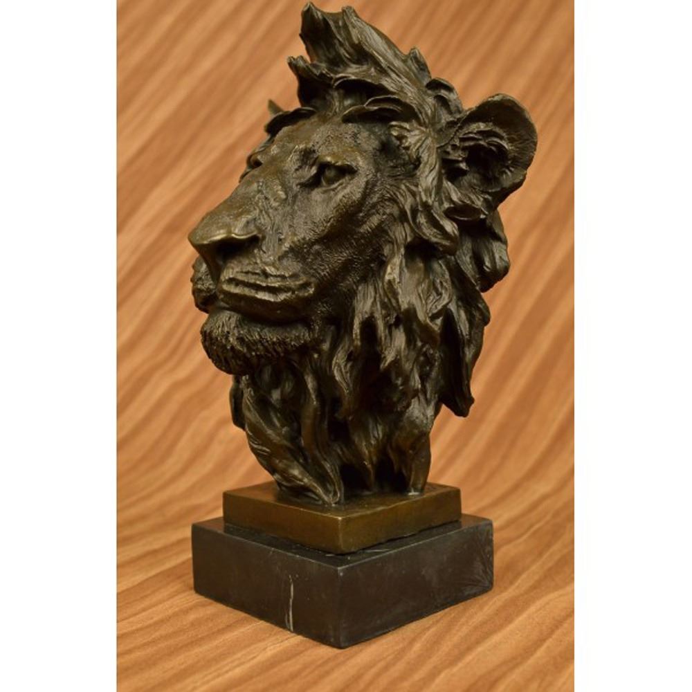 With stealth and breathtaking beauty, this Male Lion peers deep into the distance, instilling a sense of respect and exuding a natural beauty. This bronze bust of a Lion captures the true characteristics and life-like qualities of this animal beautifully. The presentation of the bust is exquisite as it presents itself with pride. The bust has amazing detail which the artist has captured by creating impressions in the bronze acting as the spotted coat on the gorgeous feline. This sculpture was cast using the Lost Wax Method it has a brown patina and is mounted on a marble base. Bronze Dimensions with Marble Base: Height 9 X Width 4 inches. Weight: 6 LBS.