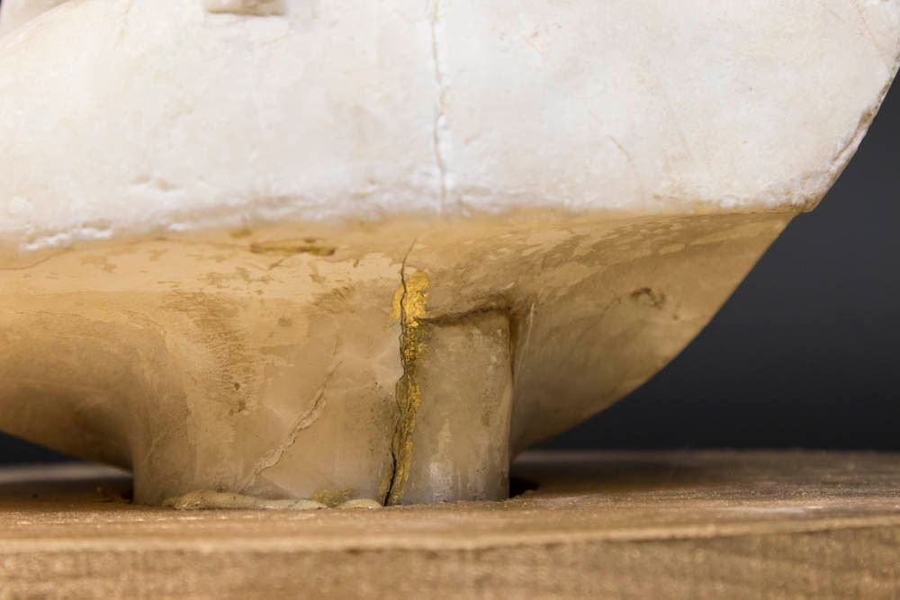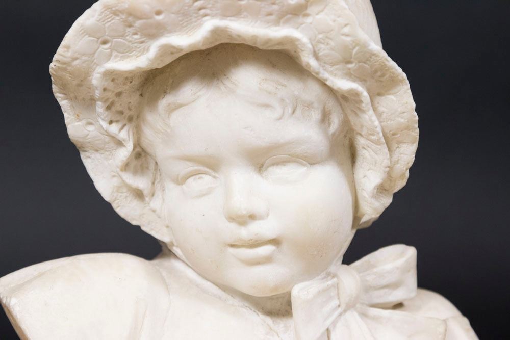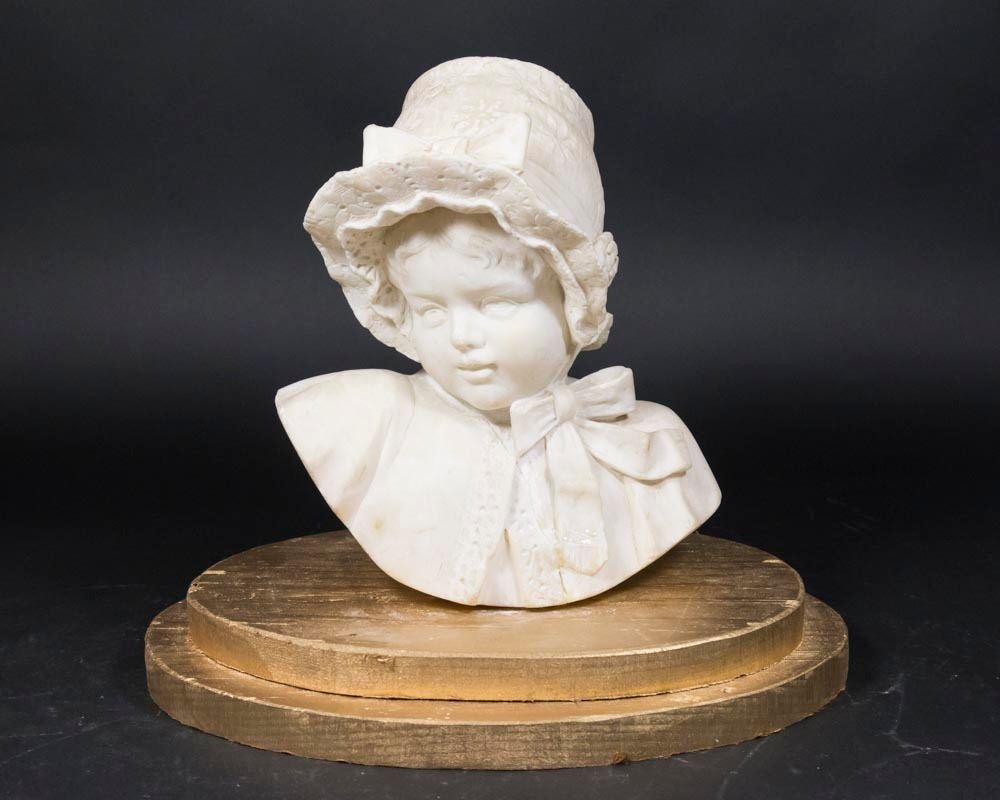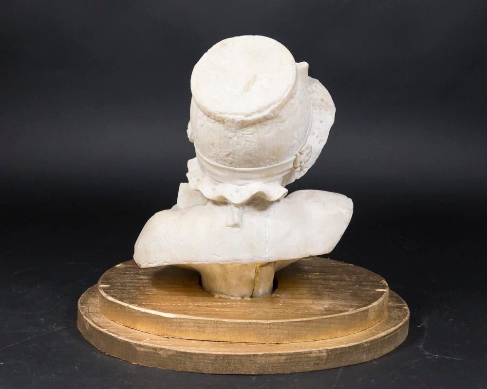 Carved alabaster. Bust approx. 7 1/2" H x 10 1/2" W. Cracked on wood base.