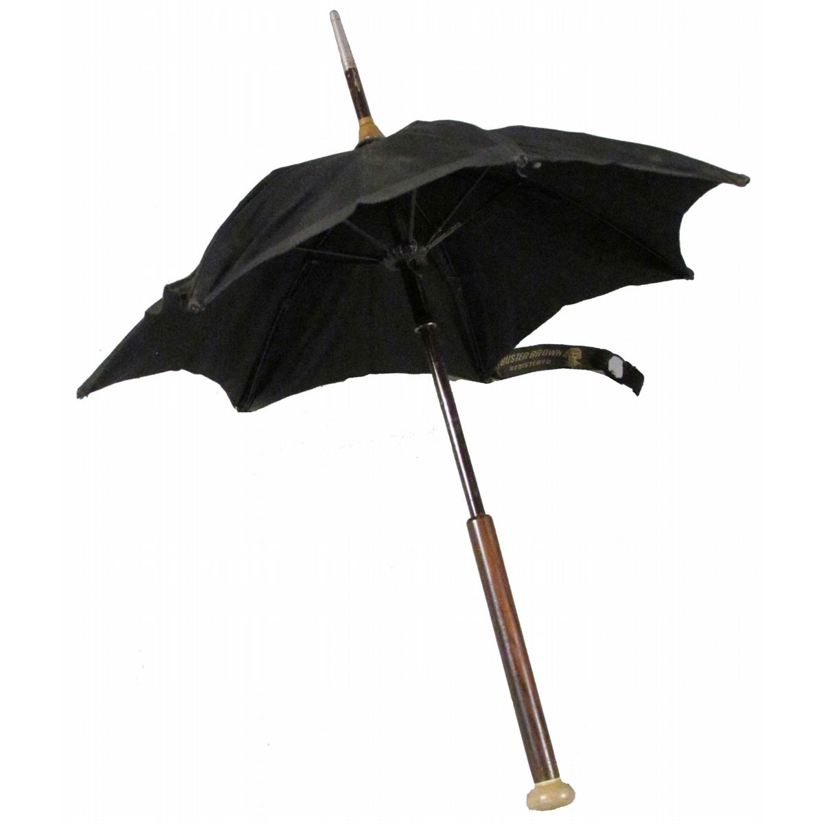Buster Brown Miniature Umbrella. Was purchased in New York City. Most likely used in store display but was believed to be a Salesman Sample. In perfect working order. Measures 14 1/4 inches tall.