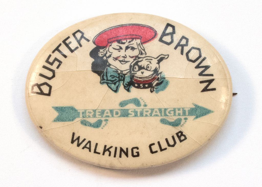 Approx. 41 by 31 mm pinback button - "Buster Brown Tread Straight Walking Club"