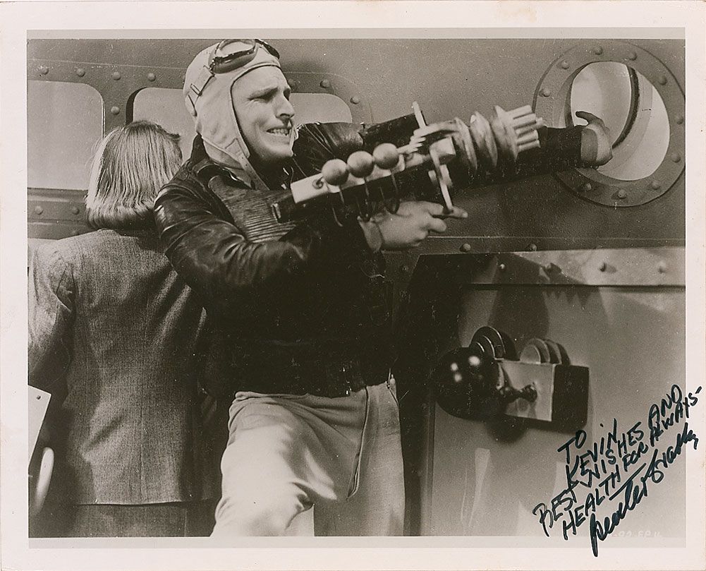 Glossy 10 x 8 photo of Flash Gordon preparing his ray gun, signed and inscribed in black felt tip “To Kevin, Best wishes and health for always—Buster Crabbe.” Scattered light creasing and rubbing to finish, otherwise fine condition.