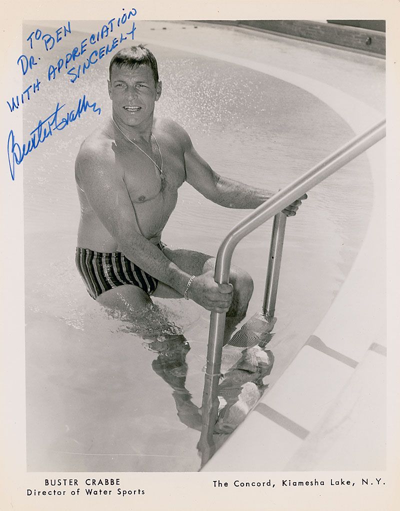 Glossy 8 x 10 photo promoting Crabbe as Director of Water Sports at The Concord in Kiamesha Lake, NY, signed and inscribed in blue felt tip “To Dr. Ben, with appreciation, sincerely, Buster Crabbe.” In fine condition, with a few scattered light creases.