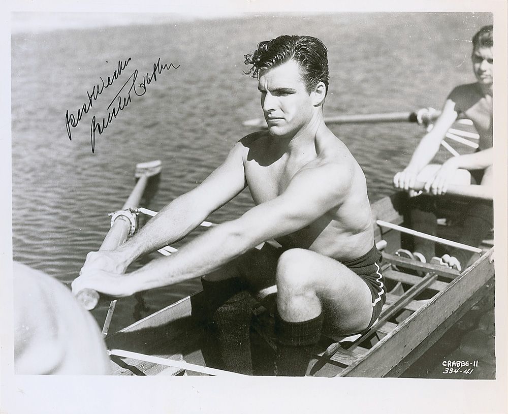 Glossy 10 x 8 photo of Crabbe in a boat, signed in black ink, “Best Wishes, Buster Crabbe.” In fine condition, with a couple dings along the top edge, and scattered mild creases and impressions.