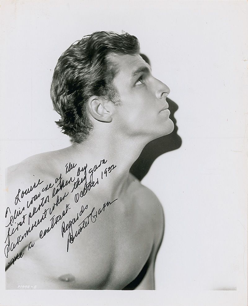 Handsome glossy 8 x 10 Paramount publicity photo of a shirtless Crabbe, signed and inscribed in black felt tip “Louise, this was one of the first photos taken by Paramount when they gave me a contract—October 1932, Regards, Buster Crabbe.” Scattered creases, a couple light spots of soiling, a small border tear to the upper right repaired with tape on the reverse, and a horizontal streak to the finish, otherwise fine condition.