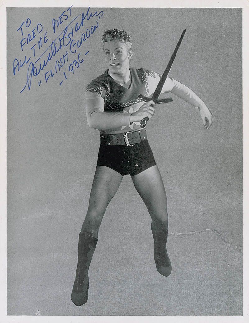 Semi-glossy 7.75 x 10 cardstock photo, signed and inscribed in blue felt tip “To Fred, All the best, Buster Crabbe, ‘Flash Gordon,’ 1936.” In fine condition.