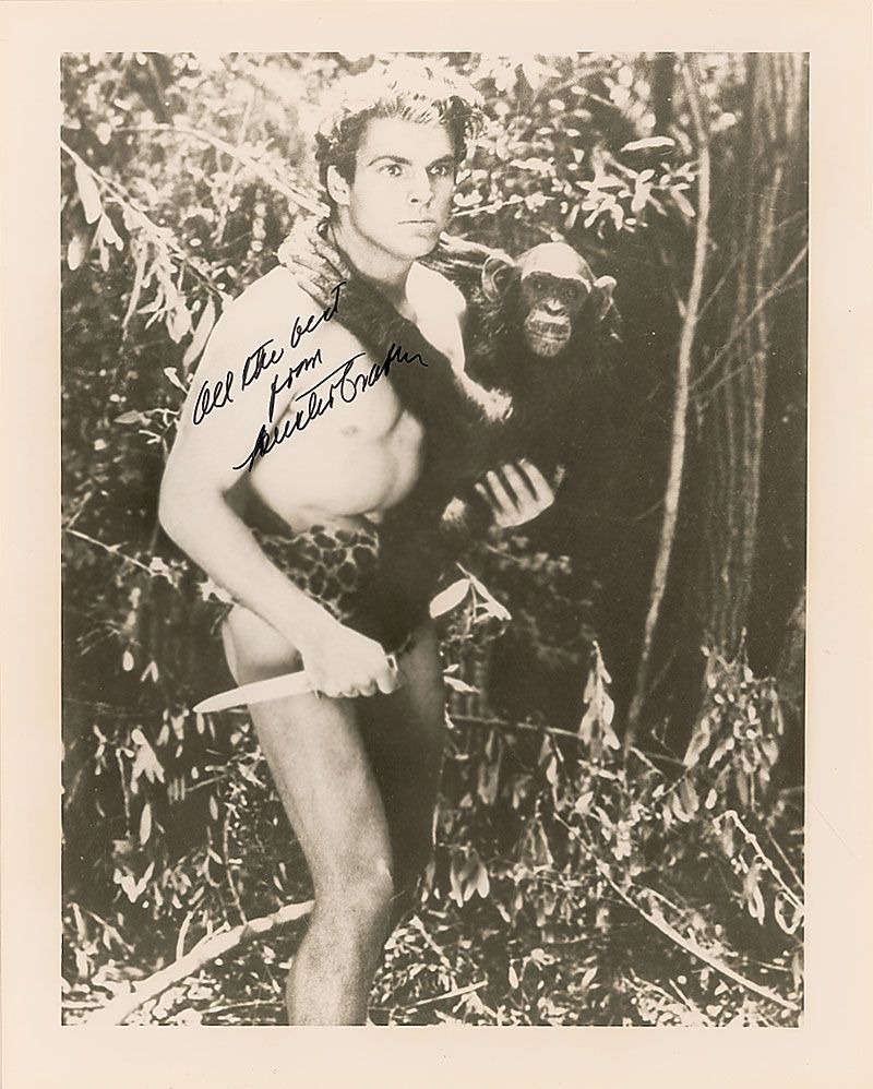 Glossy 8 x 10 photo of Crabbe as Tarzan holding a chimpanzee, signed in black felt tip, “All the best, from Buster Crabbe.” In very fine condition.