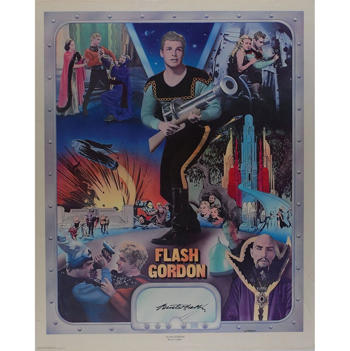 Color limited edition 24 x 30 poster entitled ‘Flash Gordon,’ numbered 679/1500, signed in black felt tip. Scattered light creasing, few tears along edges, and minor scattered soiling, otherwise fine condition. Rolled.