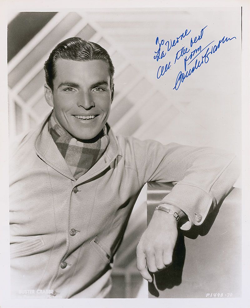Glossy 8 x 10 photo of Crabbe in a winter coat, signed and inscribed in blue felt tip, “To LaVerne, All the best, from Buster Crabbe.” In fine condition.