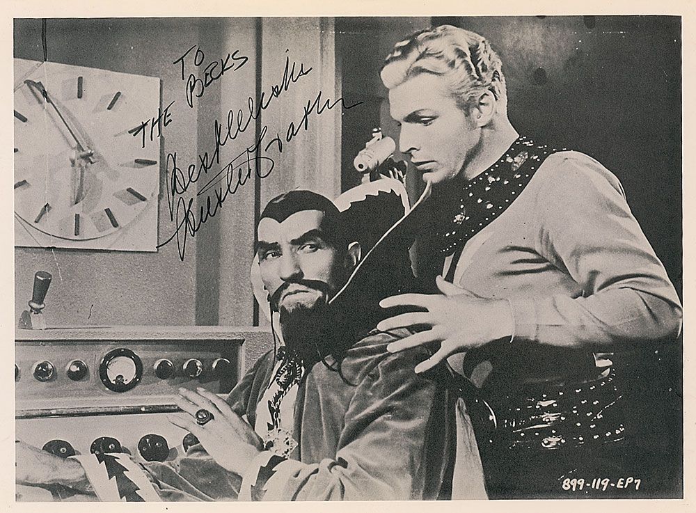 Great 9.75 x 7.25 cardstock photo of Crabbe as Flash Gordon, signed and inscribed in black ink, “To the Becks, Best Wishes, Buster Crabbe.” In fine condition.